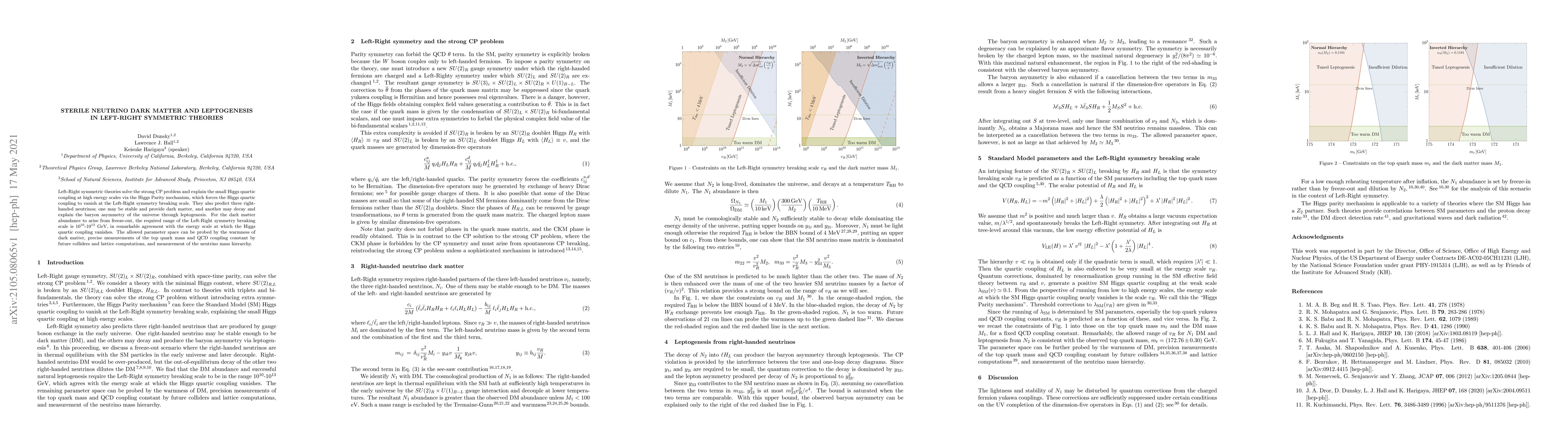 This paper explores Left-Right symmetric theories that address the strong CP problem and predict sterile neutrinos as a dark matter candidate. It also discusses how these theories can explain the baryon asymmetry via leptogenesis, with the dark matter abundance arising from the freeze-out mechanism at a specific energy scale.