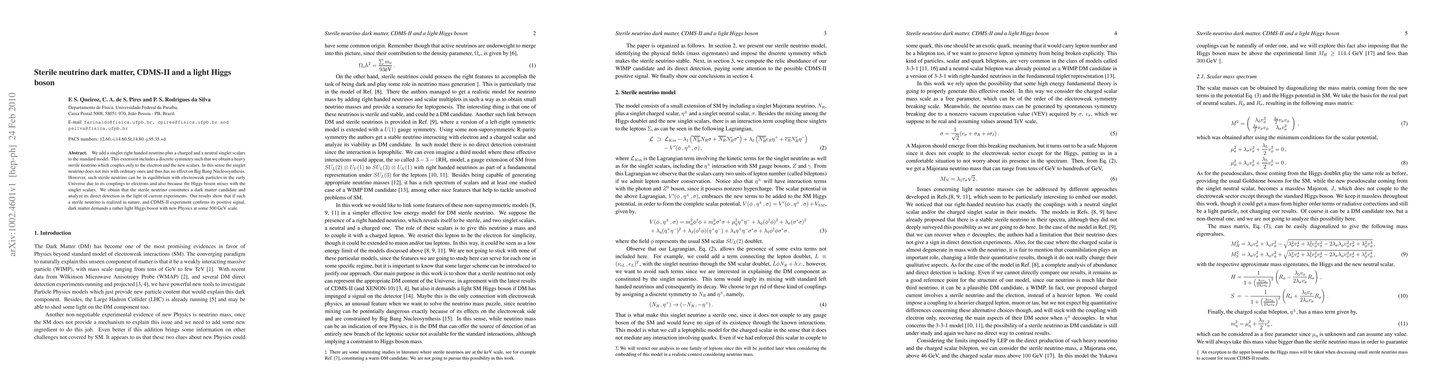 This paper proposes a model extending the Standard Model with sterile neutrinos and new scalars, suggesting that the sterile neutrino could serve as dark matter. The model predicts that if CDMS-II confirms the sterile neutrino's presence, it implies a light Higgs boson and new physics around the 500 GeV scale.