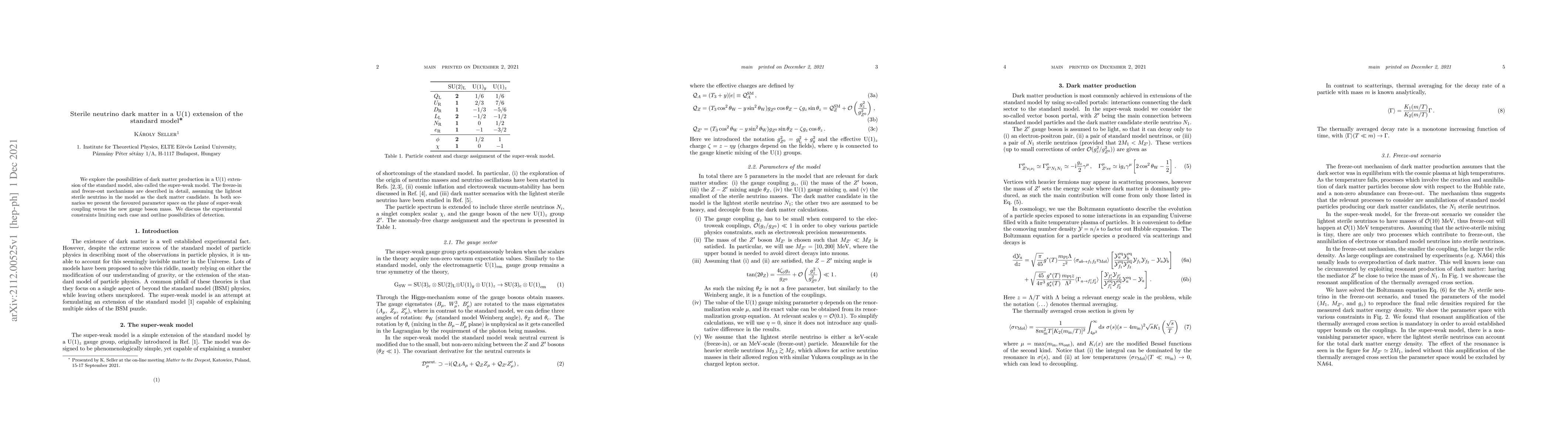 This paper investigates dark matter production in a U(1) extension of the standard model, focusing on the lightest sterile neutrino as a candidate. It details freeze-in and freeze-out mechanisms and presents favored parameter spaces, while discussing experimental constraints and potential detection methods.