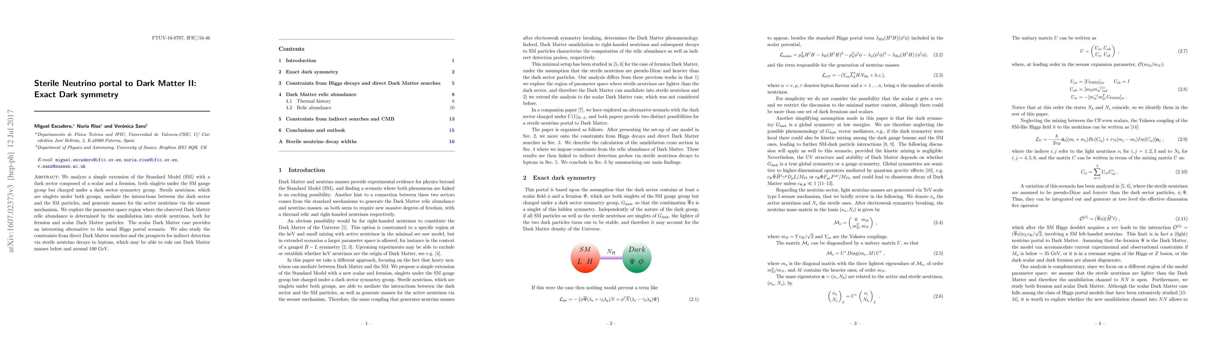This paper explores a Standard Model extension with a dark sector featuring a scalar and fermion, both charged under a dark symmetry, and sterile neutrinos mediating interactions. It investigates the parameter space where sterile neutrinos determine the Dark Matter relic abundance, considering both fermion and scalar Dark Matter, and examines constraints from direct searches and indirect detection prospects via sterile neutrino decays.
