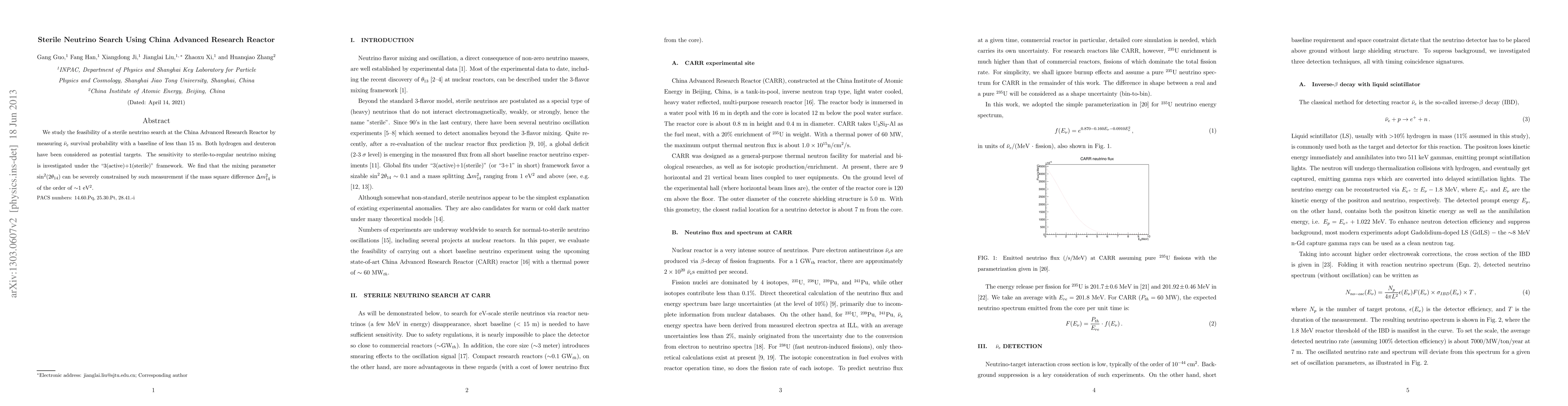 This study explores the potential of using the China Advanced Research Reactor to detect sterile neutrinos by measuring electron antineutrino survival probability. The research investigates the sensitivity to sterile-to-regular neutrino mixing, finding that significant constraints on the mixing parameter can be achieved if the mass square difference is around 1 eV$^2$.