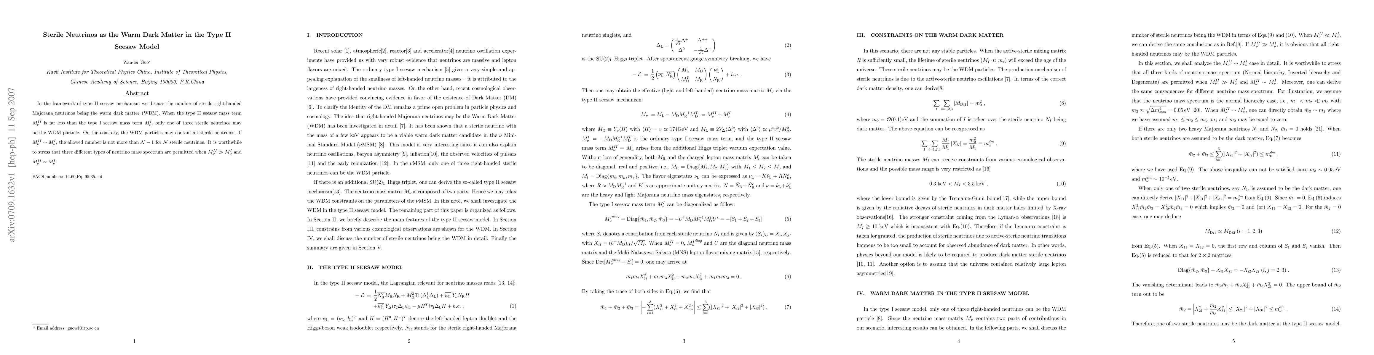 In the framework of type II seesaw mechanism we discuss the number of sterile right-handed Majorana neutrinos being the warm dark matter (WDM). When the type II seesaw mass term $M_\nu ^{II}$ is far less than the type I seesaw mass term $M_\nu ^{I}$, only one of three sterile neutrinos may be the WDM particle. On the contrary, the WDM particles may contain all sterile neutrinos. If $M_\nu ^{II} \sim M_\nu ^{I}$, the allowed number is not more than $N - 1$ for $N$ sterile neutrinos. It is worthwhile to stress that three different types of neutrino mass spectrum are permitted when $M_\nu ^{II} \gg M_\nu ^{I}$ and $M_\nu ^{II} \sim M_\nu ^{I}$.