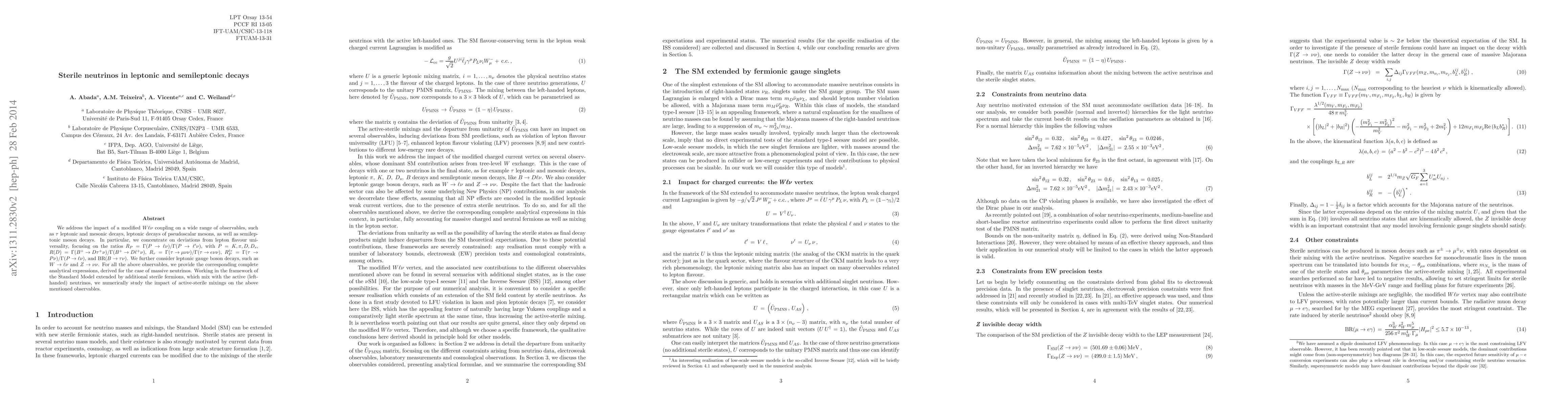 This paper investigates the effects of modified $W \ell \nu$ couplings due to sterile neutrinos on various decay processes, focusing on deviations from lepton flavor universality. It provides analytical expressions for a range of observables, including ratios of decay rates for pseudoscalar mesons and tau leptons, and studies the impact of active-sterile neutrino mixing within the extended Standard Model framework.