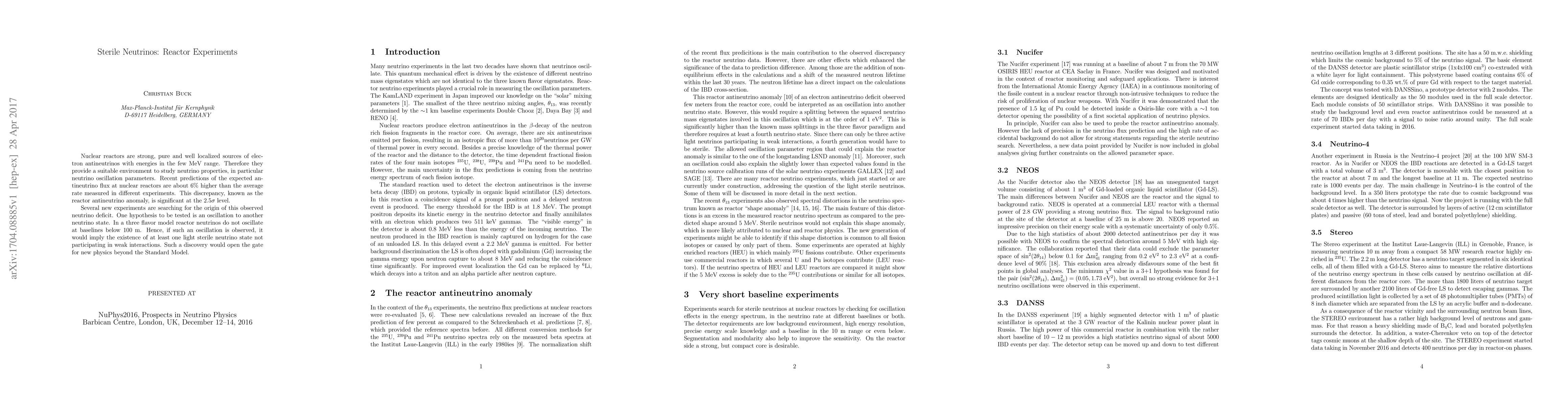 Nuclear reactors are strong, pure and well localized sources of electron antineutrinos with energies in the few MeV range. Therefore they provide a suitable environment to study neutrino properties, in particular neutrino oscillation parameters. Recent predictions of the expected antineutrino flux at nuclear reactors are about 6% higher than the average rate measured in different experiments. This discrepancy, known as the reactor antineutrino anomaly, is significant at the 2.5{\sigma} level. Several new experiments are searching for the origin of this observed neutrino deficit. One hypothesis to be tested is an oscillation to another neutrino state. In a three flavor model reactor neutrinos do not oscillate at baselines below 100 m. Hence, if such an oscillation is observed, it would imply the existence of at least one light sterile neutrino state not participating in weak interactions. Such a discovery would open the gate for new physics beyond the Standard Model.