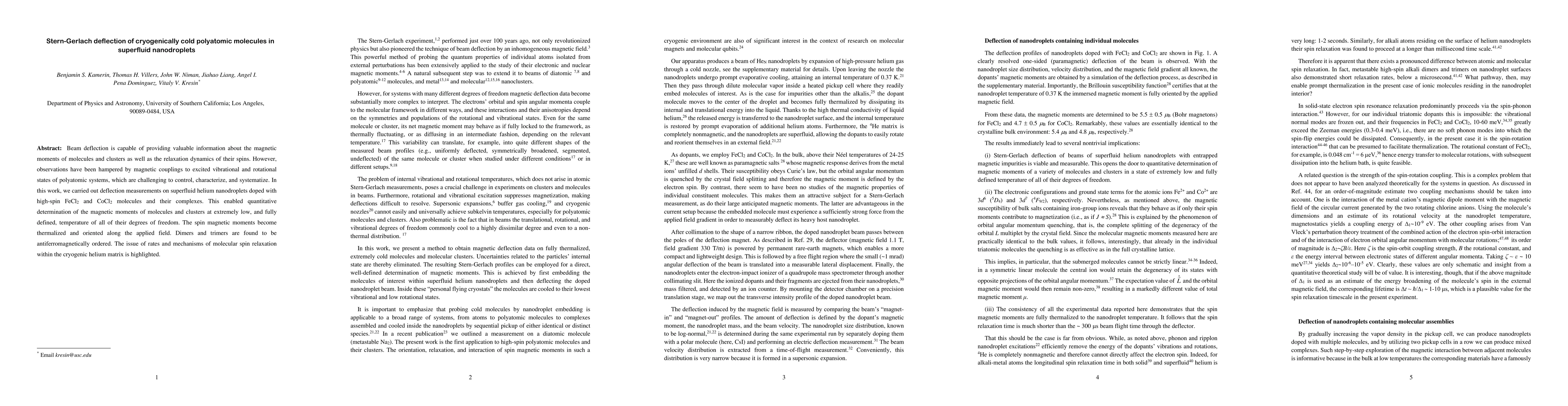 Beam deflection is capable of providing valuable information about the magnetic moments of molecules and clusters as well as the relaxation dynamics of their spins. However, observations have been hampered by magnetic couplings to excited vibrational and rotational states of polyatomic systems, which are challenging to control, characterize, and systematize. In this work, we carried out deflection measurements on superfluid helium nanodroplets doped with high-spin FeCl2 and CoCl2 molecules and their complexes. This enabled quantitative determination of the magnetic moments of molecules and clusters at extremely low, and fully defined, temperature of all of their degrees of freedom. The spin magnetic moments become thermalized and oriented along the applied field. Dimers and trimers are found to be antiferromagnetically ordered. The issue of rates and mechanisms of molecular spin relaxation within the cryogenic helium matrix is highlighted.