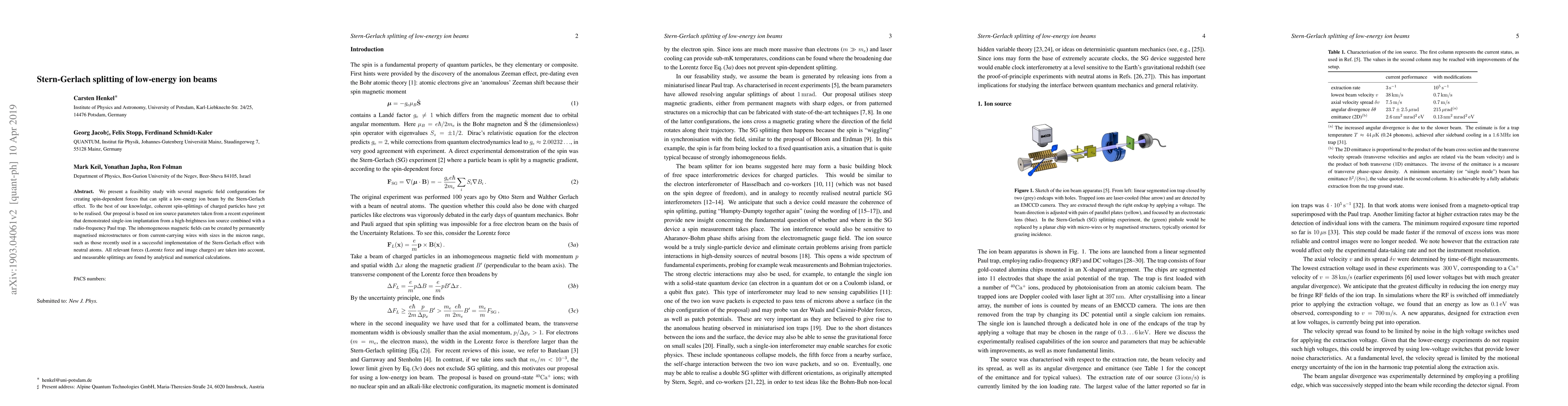 This study explores magnetic field configurations for achieving coherent spin-dependent splitting of low-energy ion beams via the Stern-Gerlach effect, utilizing parameters from a recent high-brightness ion source experiment. Both analytical and numerical methods predict measurable splittings, considering Lorentz force and image charges.
