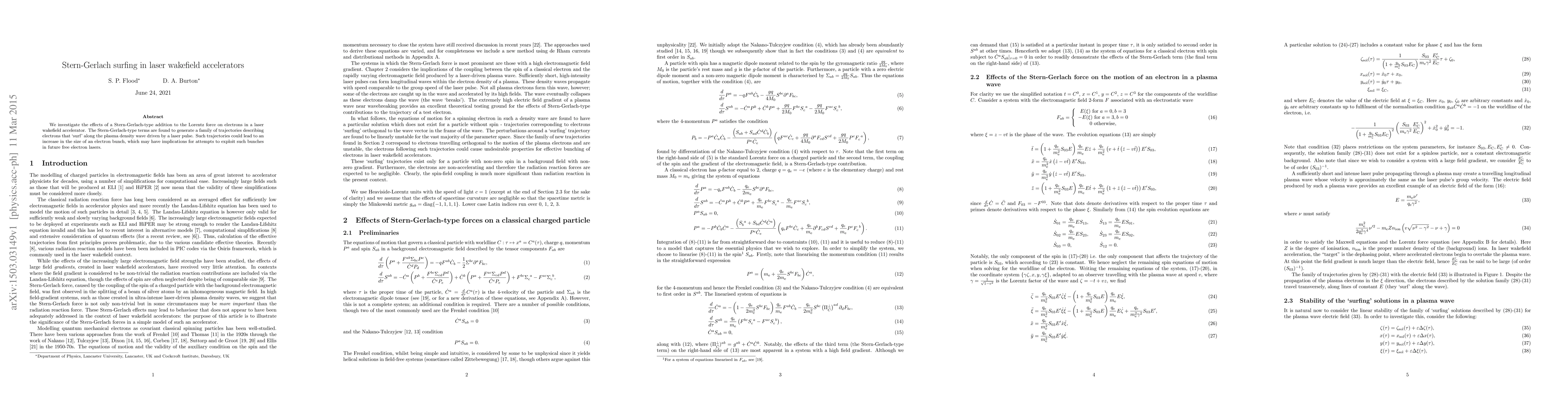 We investigate the effects of a Stern-Gerlach-type addition to the Lorentz force on electrons in a laser wakefield accelerator. The Stern-Gerlach-type terms are found to generate a family of trajectories describing electrons that surf along the plasma density wave driven by a laser pulse. Such trajectories could lead to an increase in the size of an electron bunch, which may have implications for attempts to exploit such bunches in future free electron lasers.