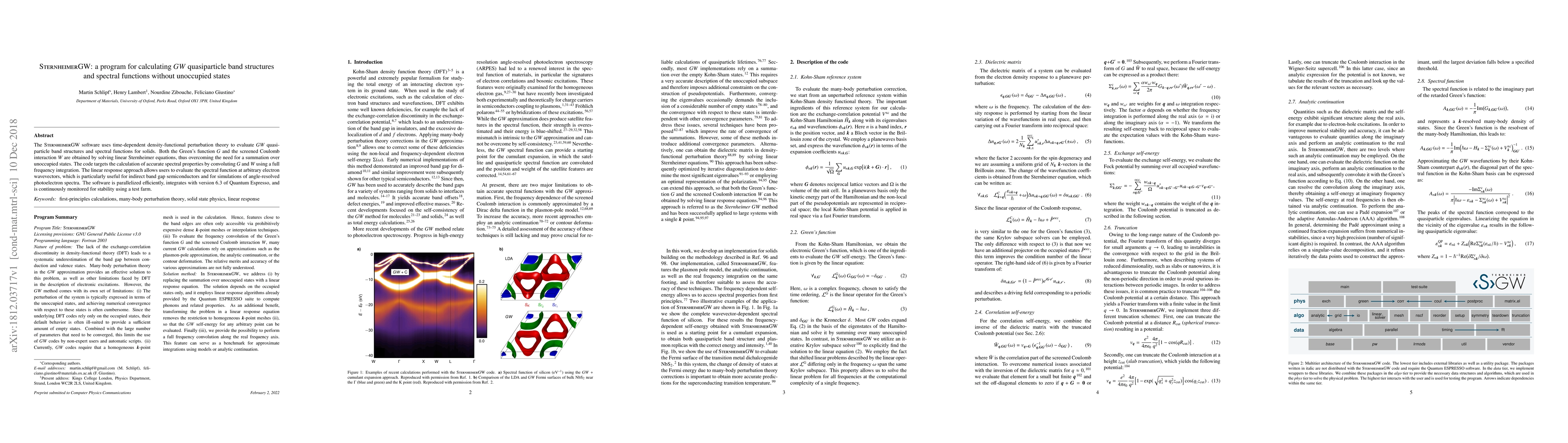 The SternheimerGW software calculates GW quasiparticle band structures and spectral functions for solids using time-dependent density-functional perturbation theory, allowing for accurate spectral properties without summation over unoccupied states.