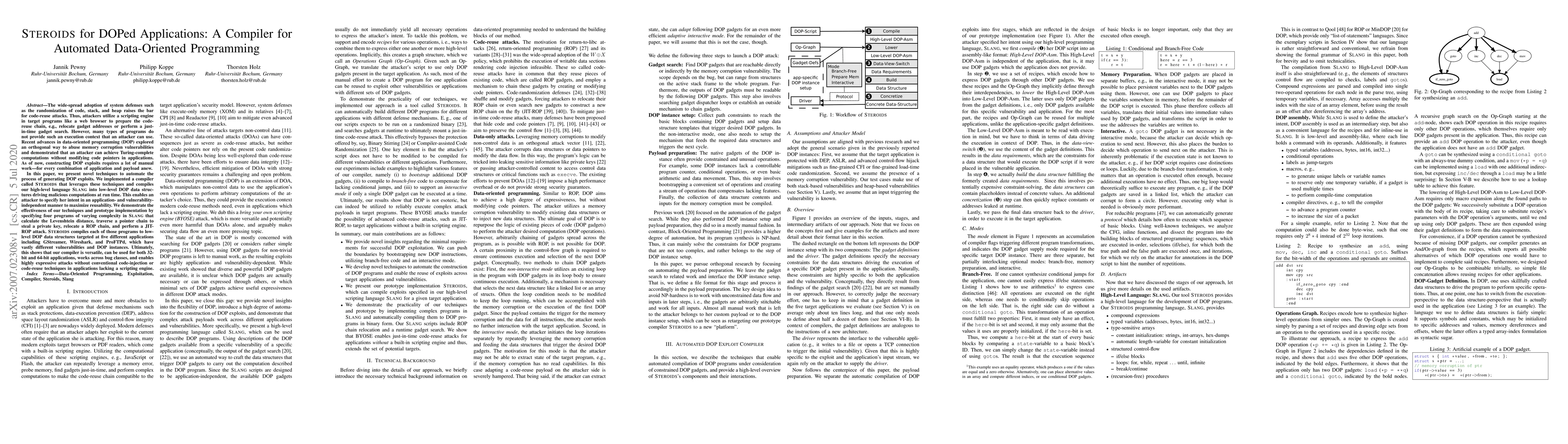 The wide-spread adoption of system defenses such as the randomization of code, stack, and heap raises the bar for code-reuse attacks. Thus, attackers utilize a scripting engine in target programs like a web browser to prepare the code-reuse chain, e.g., relocate gadget addresses or perform a just-in-time gadget search. However, many types of programs do not provide such an execution context that an attacker can use. Recent advances in data-oriented programming (DOP) explored an orthogonal way to abuse memory corruption vulnerabilities and demonstrated that an attacker can achieve Turing-complete computations without modifying code pointers in applications. As of now, constructing DOP exploits requires a lot of manual work. In this paper, we present novel techniques to automate the process of generating DOP exploits. We implemented a compiler called Steroids that compiles our high-level language SLANG into low-level DOP data structures driving malicious computations at run time. This enables an attacker to specify her intent in an application- and vulnerability-independent manner to maximize reusability. We demonstrate the effectiveness of our techniques and prototype implementation by specifying four programs of varying complexity in SLANG that calculate the Levenshtein distance, traverse a pointer chain to steal a private key, relocate a ROP chain, and perform a JIT-ROP attack. Steroids compiles each of those programs to low-level DOP data structures targeted at five different applications including GStreamer, Wireshark, and ProFTPd, which have vastly different vulnerabilities and DOP instances. Ultimately, this shows that our compiler is versatile, can be used for both 32- and 64-bit applications, works across bug classes, and enables highly expressive attacks without conventional code-injection or code-reuse techniques in applications lacking a scripting engine.