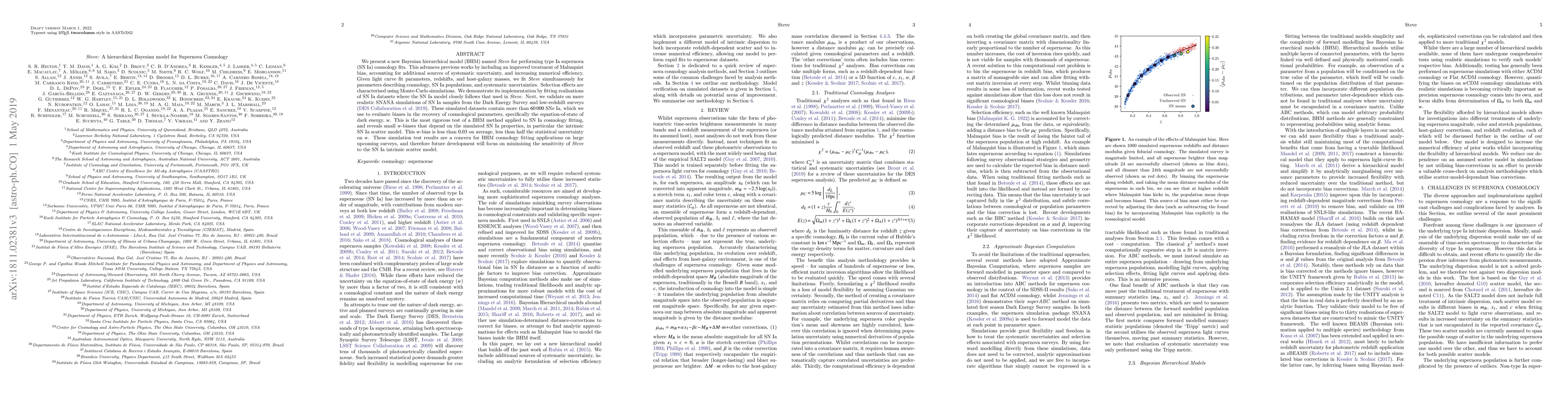 The paper introduces Steve, a Bayesian hierarchical model for fitting type Ia supernovae (SNIa) to cosmology, improving upon previous methods by addressing Malmquist bias and systematic uncertainties. The model's performance is rigorously tested on large simulated datasets, revealing small biases in the equation-of-state of dark energy, $w$, which are less than half the statistical uncertainty, but future work will aim to reduce this sensitivity.
