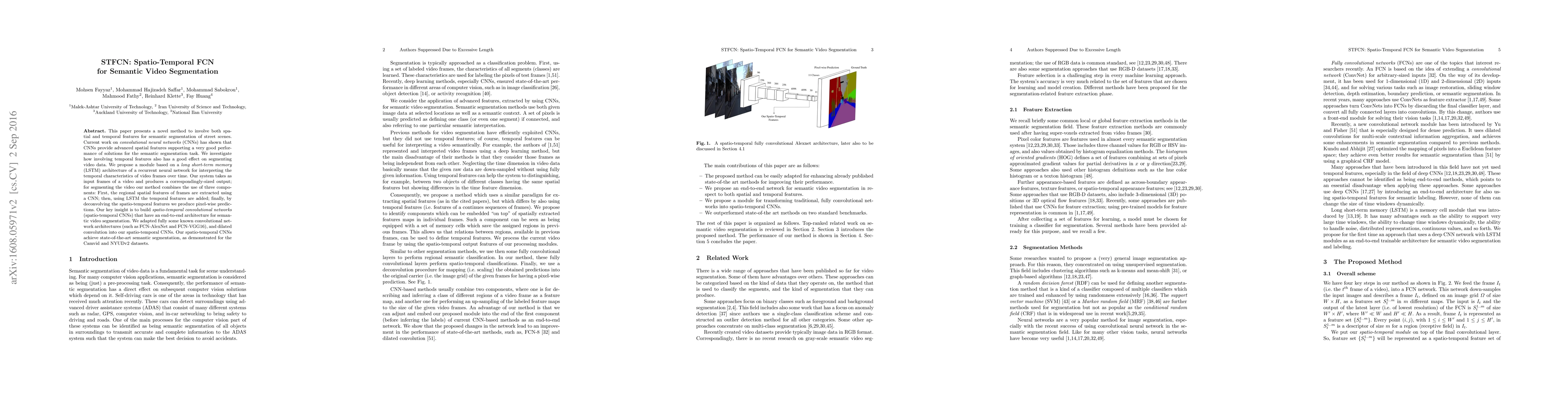 This paper introduces a novel spatio-temporal convolutional network (STFCN) that combines spatial and temporal features for semantic video segmentation, utilizing CNNs for spatial features and LSTM for temporal features, achieving state-of-the-art performance on Camvid and NYUDv2 datasets.