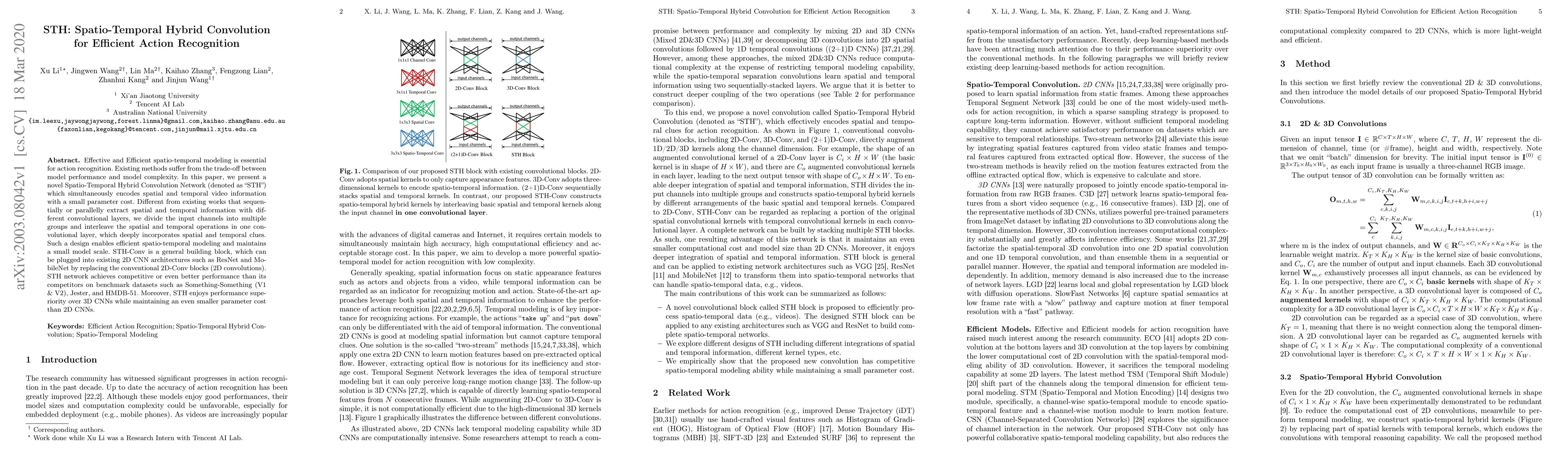 A new spatio-temporal hybrid convolution network (STH) improves action recognition efficiency and performance by interleaving spatial and temporal operations in one convolutional layer. It achieves competitive or better results than existing methods with a smaller parameter cost.