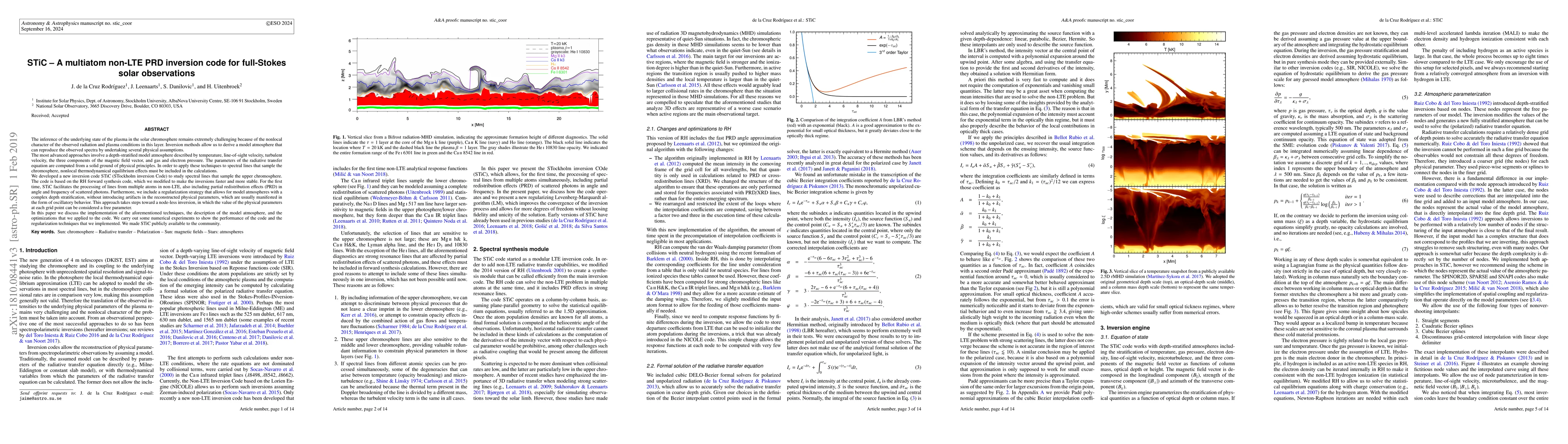 The research introduces STiC, a new inversion code for analyzing full-Stokes solar observations in the upper chromosphere. STiC, built on the RH synthesis code, enables faster, stable non-LTE inversions for multiple atoms, incorporating partial redistribution effects. It also introduces a regularization strategy to avoid artifacts in reconstructed parameters, moving towards node-less inversions, and is now publicly accessible.