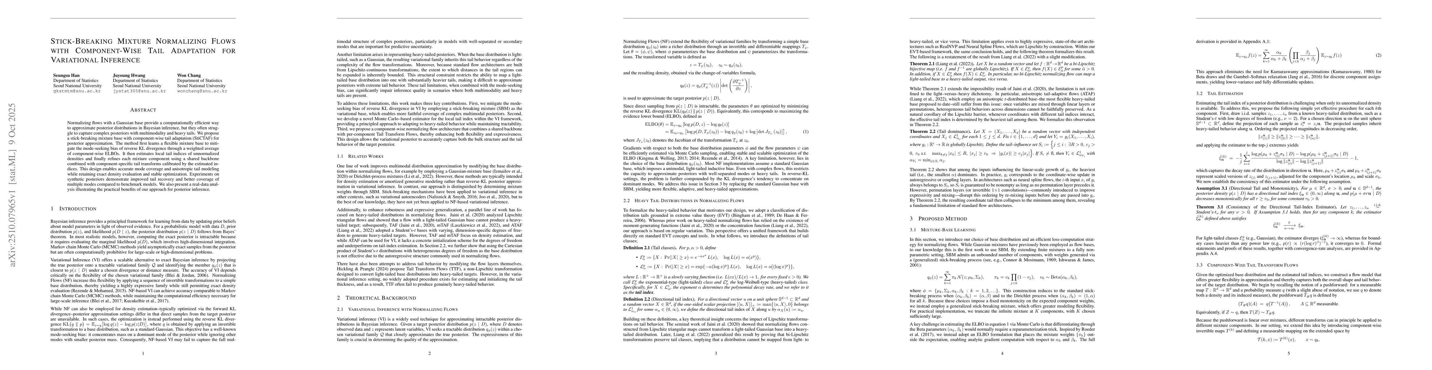 Normalizing flows with a Gaussian base provide a computationally efficient way to approximate posterior distributions in Bayesian inference, but they often struggle to capture complex posteriors with multimodality and heavy tails. We propose a stick-breaking mixture base with component-wise tail adaptation (StiCTAF) for posterior approximation. The method first learns a flexible mixture base to mitigate the mode-seeking bias of reverse KL divergence through a weighted average of component-wise ELBOs. It then estimates local tail indices of unnormalized densities and finally refines each mixture component using a shared backbone combined with component-specific tail transforms calibrated by the estimated indices. This design enables accurate mode coverage and anisotropic tail modeling while retaining exact density evaluation and stable optimization. Experiments on synthetic posteriors demonstrate improved tail recovery and better coverage of multiple modes compared to benchmark models. We also present a real-data analysis illustrating the practical benefits of our approach for posterior inference.