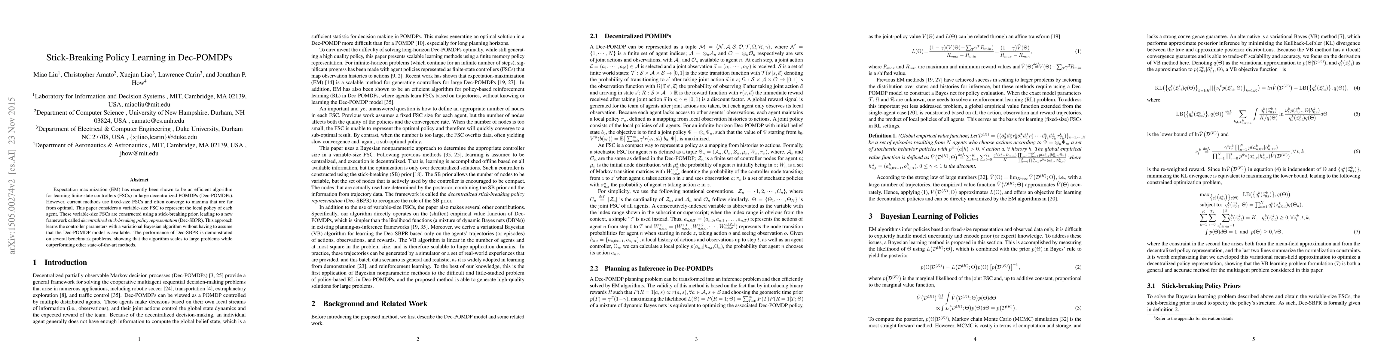 This paper introduces the decentralized stick-breaking policy representation (Dec-SBPR) framework for learning variable-size finite-state controllers (FSCs) in decentralized POMDPs (Dec-POMDPs) using a stick-breaking prior. It employs a variational Bayesian algorithm to learn controller parameters without requiring full Dec-POMDP model availability, demonstrating scalability and superior performance on benchmark problems.