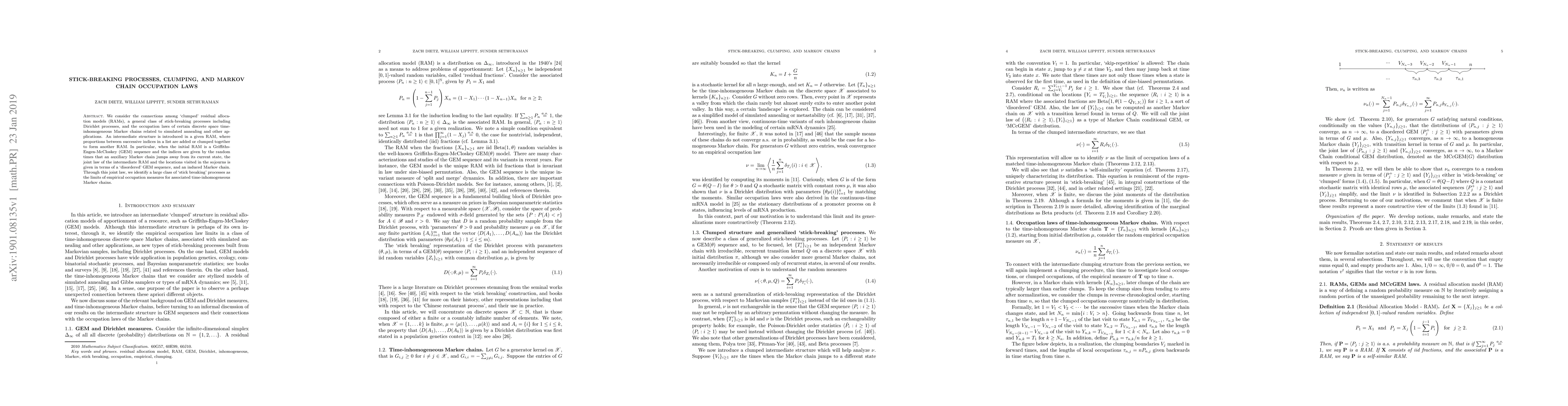 This paper explores the relationships between clumped residual allocation models, stick-breaking processes like the Dirichlet process, and the occupation laws of time-inhomogeneous Markov chains. It introduces a method to clump proportions in a residual allocation model, which leads to identifying a broad class of stick-breaking processes as limits of empirical occupation measures for related Markov chains.