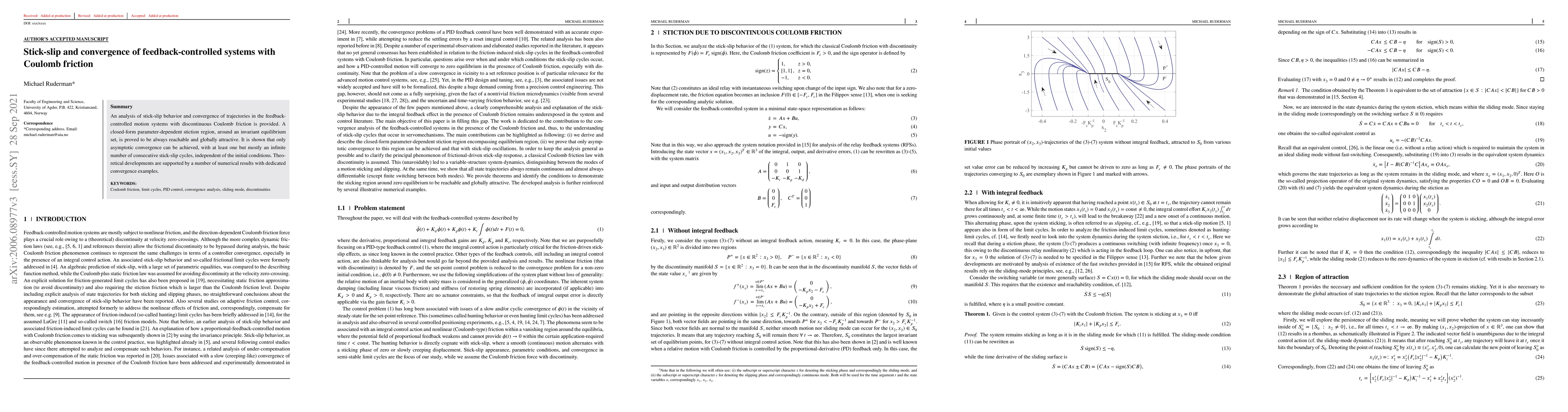 This paper analyzes stick-slip behavior and convergence in feedback-controlled systems with Coulomb friction, proving a parameter-dependent stiction region that is globally attractive. It concludes that only asymptotic convergence is achievable, often involving infinite stick-slip cycles, supported by numerical results.