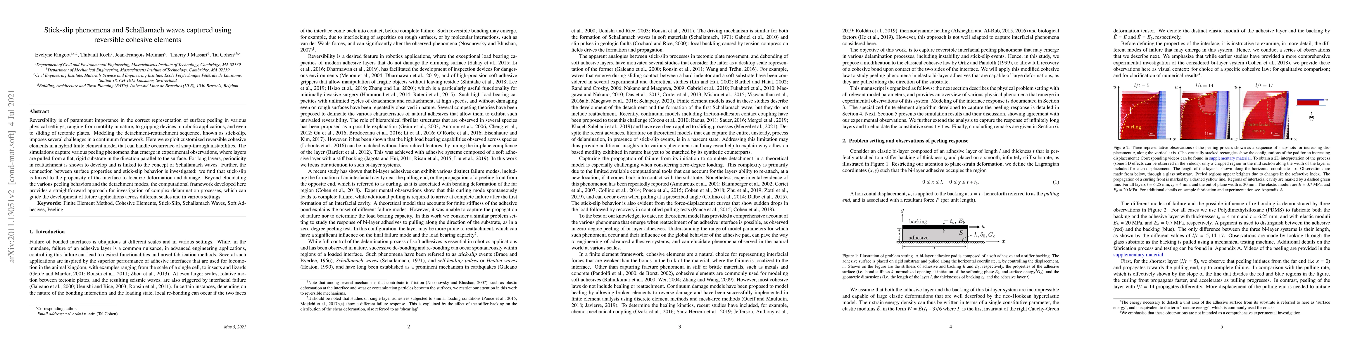 This paper presents a hybrid finite element model using reversible cohesive elements to simulate stick-slip phenomena and Schallamach waves during surface peeling. The model captures complex detachment-reattachment sequences, revealing periodic reattachment patterns linked to Schallamach waves and demonstrating the influence of surface properties on stick-slip behavior.