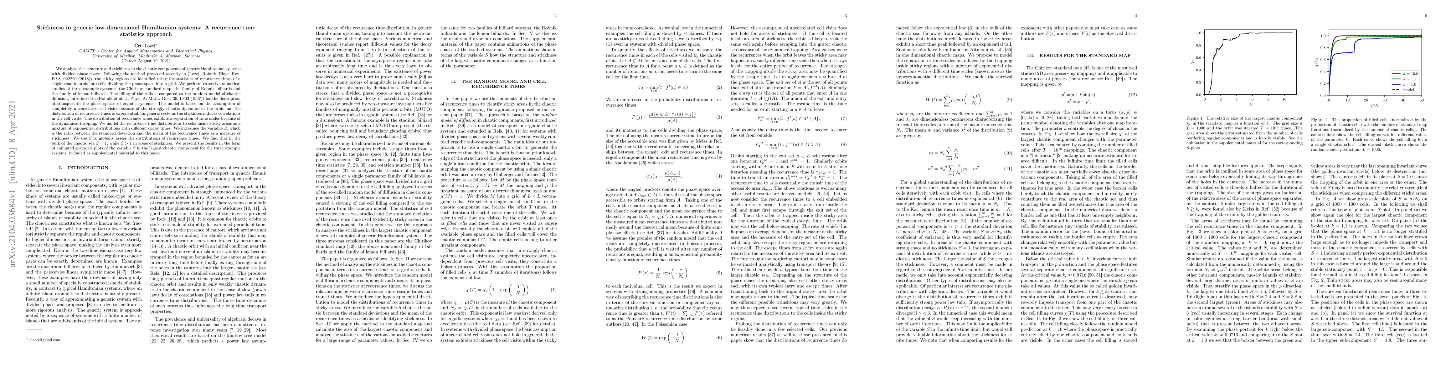 We analyze the structure and stickiness in the chaotic components of generic Hamiltonian systems with divided phase space. Following the method proposed recently in Lozej and Robnik [Phys. Rev. E 98, 022220 (2018)], the sticky regions are identified using the statistics of recurrence times of a single chaotic orbit into cells dividing the phase space into a grid. We perform extensive numerical studies of three example systems: the Chirikov standard map, the family of Robnik billiards, and the family of lemon billiards. The filling of the cells is compared to the random model of chaotic diffusion, introduced in Robnik et al. [J. Phys. A: Math. Gen. 30, L803 (1997)] for the description of transport in the phase spaces of ergodic systems. The model is based on the assumption of completely uncorrelated cell visits because of the strongly chaotic dynamics of the orbit and the distribution of recurrence times is exponential. In generic systems the stickiness induces correlations in the cell visits. The distribution of recurrence times exhibits a separation of timescales because of the dynamical trapping. We model the recurrence time distributions to cells inside sticky areas as a mixture of exponential distributions with different decay times. We introduce the variable S, which is the ratio between the standard deviation and the mean of the recurrence times as a measure of stickiness. We use S to globally assess the distributions of recurrence times. We find that in the bulk of the chaotic sea S=1, while S>1 in areas of stickiness. We present the results in the form of animated grayscale plots of the variable S in the largest chaotic component for the three example systems, included as supplemental material to this paper.