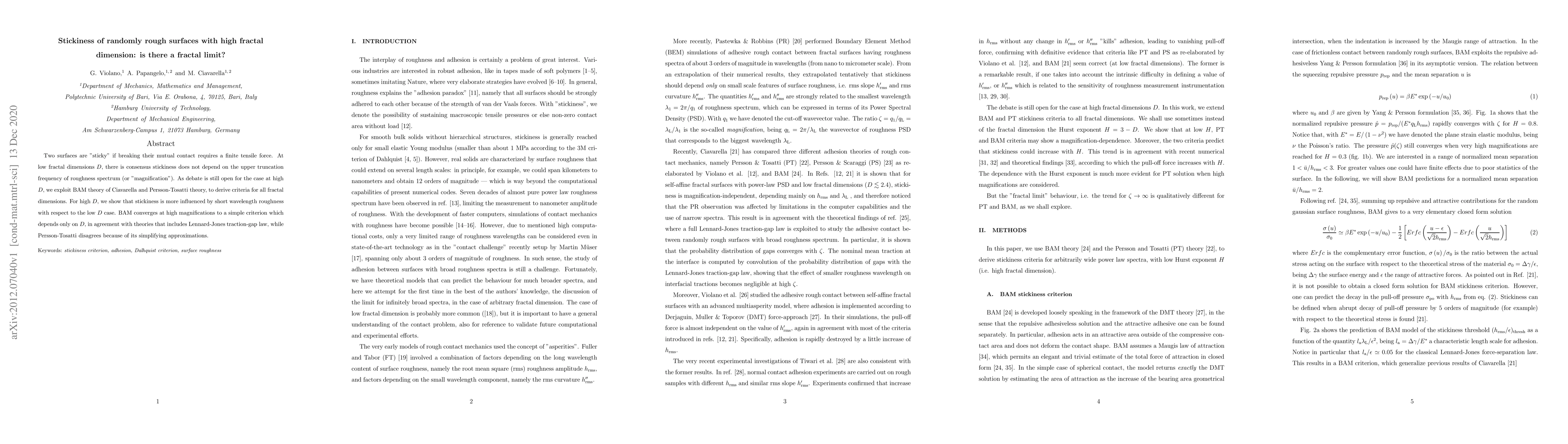 This paper explores the stickiness of randomly rough surfaces with varying fractal dimensions, showing that at high fractal dimensions, stickiness is more influenced by short wavelength roughness. It concludes that the BAM theory converges to a simple fractal dimension-dependent criterion, while the Persson-Tosatti theory diverges due to its approximations.