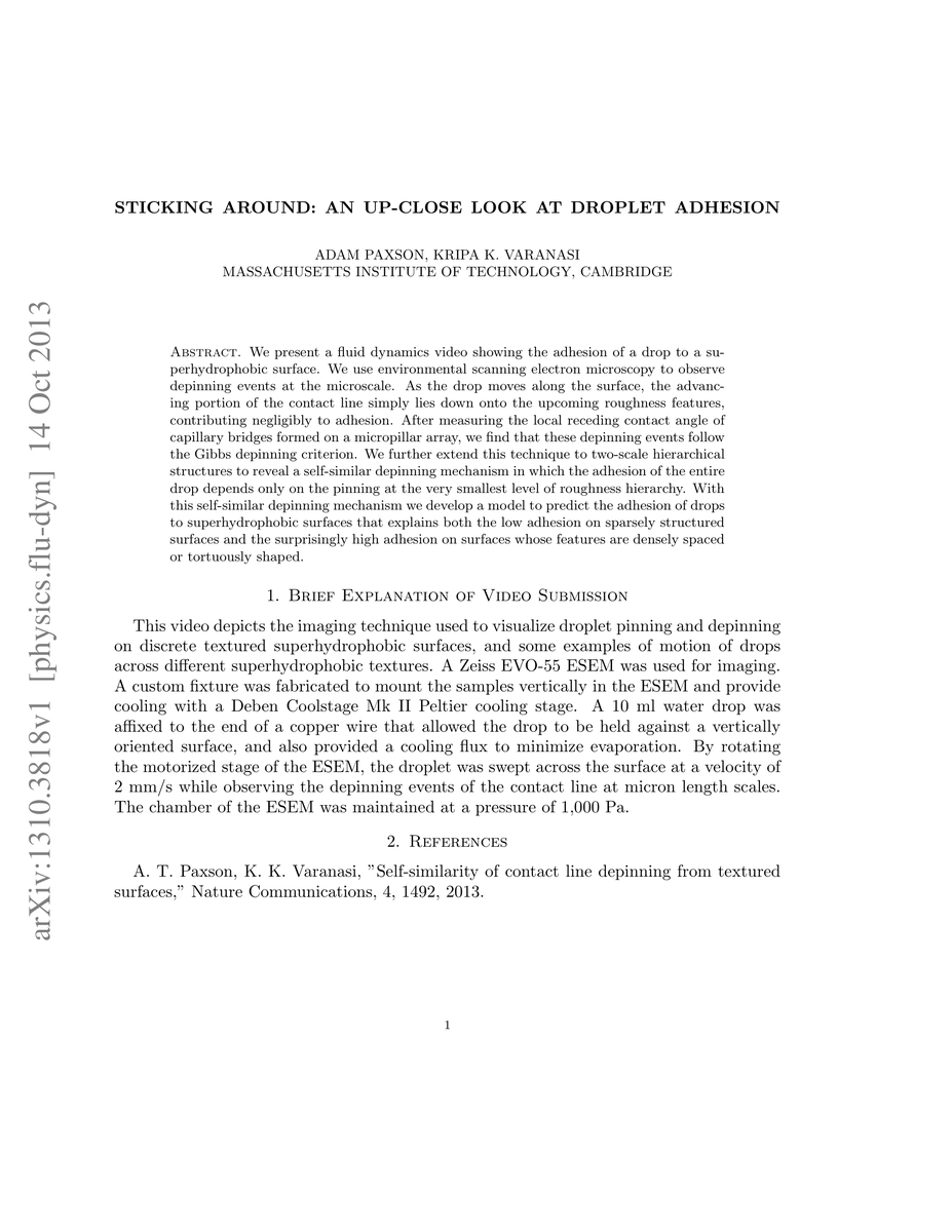 We present a fluid dynamics video showing the adhesion of a drop to a superhydrophobic surface. We use environmental scanning electron microscopy to observe depinning events at the microscale. As the drop moves along the surface, the advancing portion of the contact line simply lies down onto the upcoming roughness features, contributing negligibly to adhesion. After measuring the local receding contact angle of capillary bridges formed on a micropillar array, we find that these depinning events follow the Gibbs depinning criterion. We further extend this technique to two-scale hierarchical structures to reveal a self-similar depinning mechanism in which the adhesion of the entire drop depends only on the pinning at the very smallest level of roughness hierarchy. With this self-similar depinning mechanism we develop a model to predict the adhesion of drops to superhydrophobic surfaces that explains both the low adhesion on sparsely structured surfaces and the surprisingly high adhesion on surfaces whose features are densely spaced or tortuously shaped.