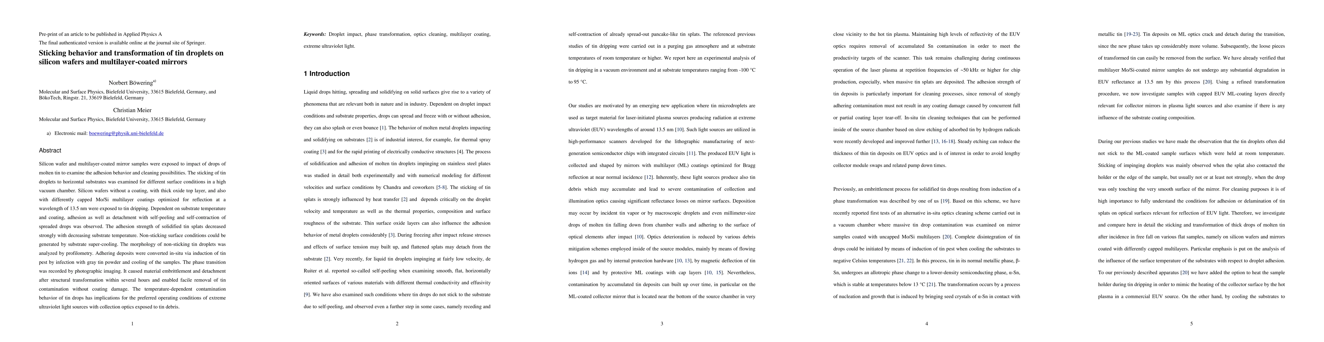 This study investigates the adhesion and transformation behavior of molten tin droplets on silicon wafers and multilayer-coated mirrors, revealing that adhesion strength decreases with lower substrate temperatures. Non-sticking conditions can be achieved by super-cooling, and solidified tin can be removed via induced phase transition to tin pest, facilitating contamination removal without damaging coatings.
