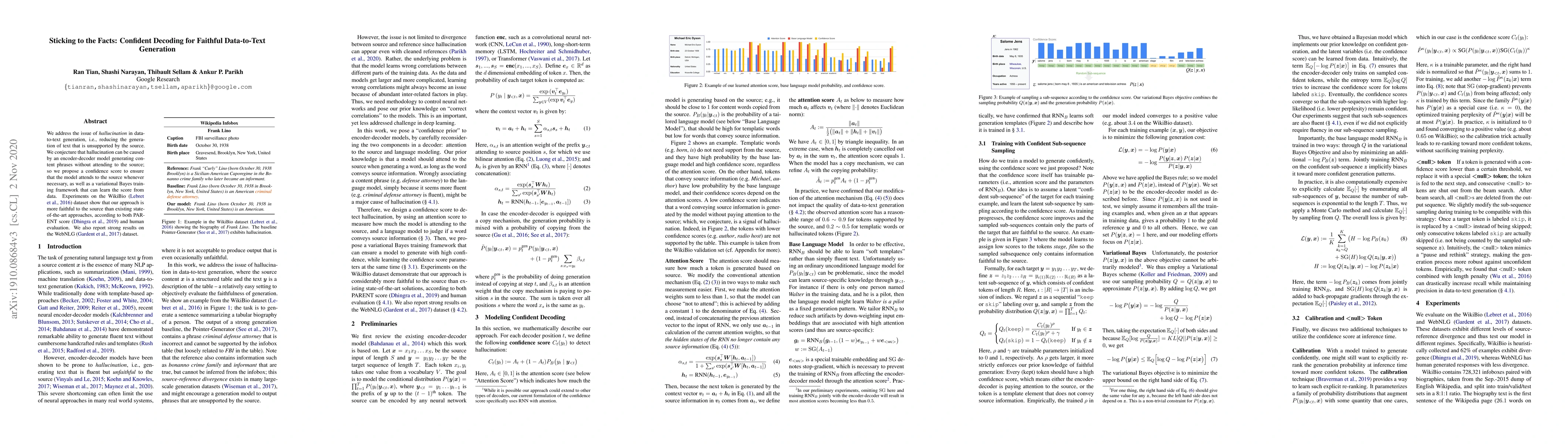 This paper tackles the issue of "hallucination" in data-to-text generation by proposing a confidence score mechanism to ensure the model attends to the source data. Experimental results on WikiBio and WebNLG datasets show improved fidelity compared to existing methods, as measured by PARENT score and human evaluation.