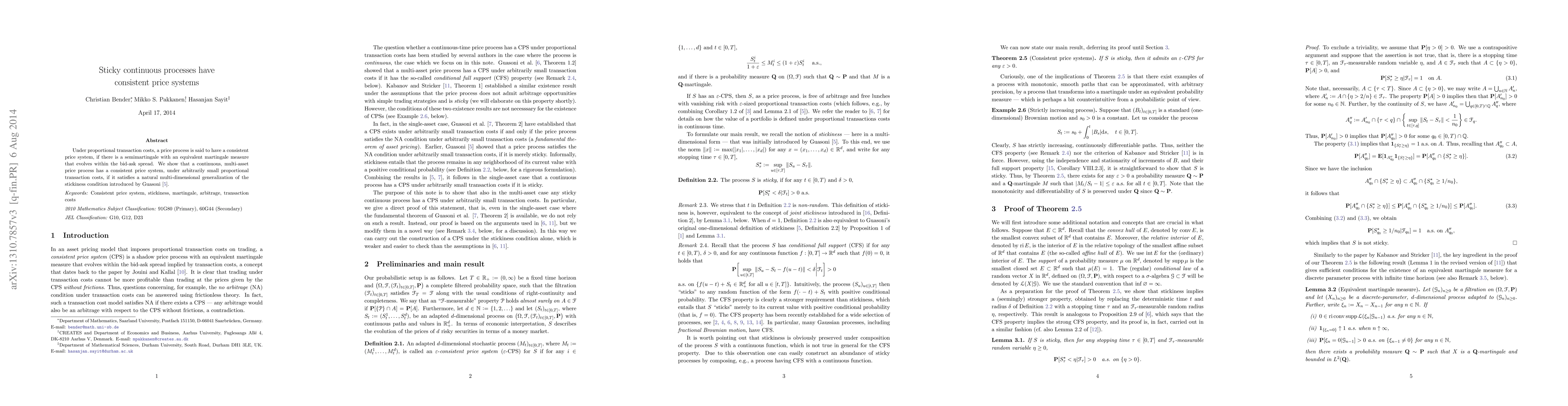 Under proportional transaction costs, a price process is said to have a consistent price system, if there is a semimartingale with an equivalent martingale measure that evolves within the bid-ask spread. We show that a continuous, multi-asset price process has a consistent price system, under arbitrarily small proportional transaction costs, if it satisfies a natural multi-dimensional generalization of the stickiness condition introduced by Guasoni [Math. Finance 16(3), 569-582 (2006)].