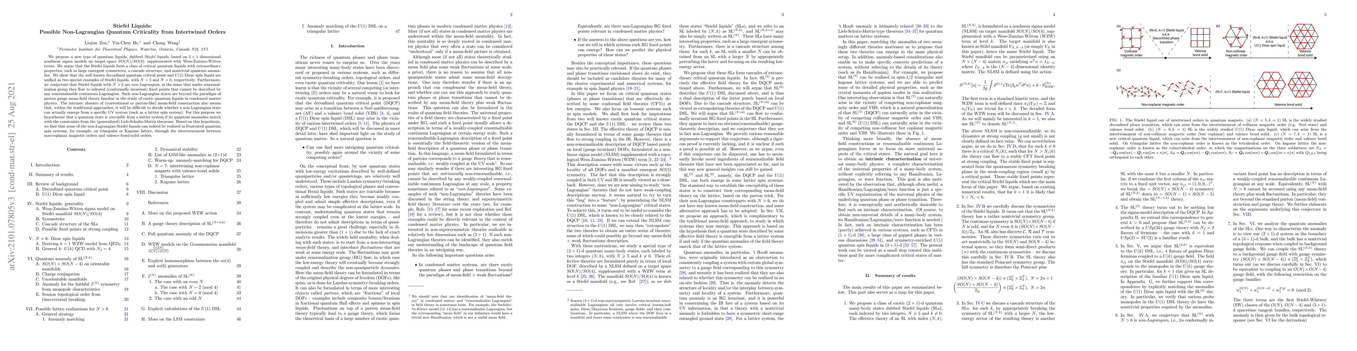 This paper introduces Stiefel liquids, a novel class of quantum liquids based on nonlinear sigma models with Wess-Zumino-Witten terms, characterized by large emergent symmetries and nontrivial quantum anomalies. The authors conjecture that Stiefel liquids with $N>6$ are non-Lagrangian, implying they cannot be described by conventional renormalizable Lagrangians, and propose that their emergence from lattice systems can be determined by matching quantum anomalies with Lieb-Schultz-Mattis constraints.