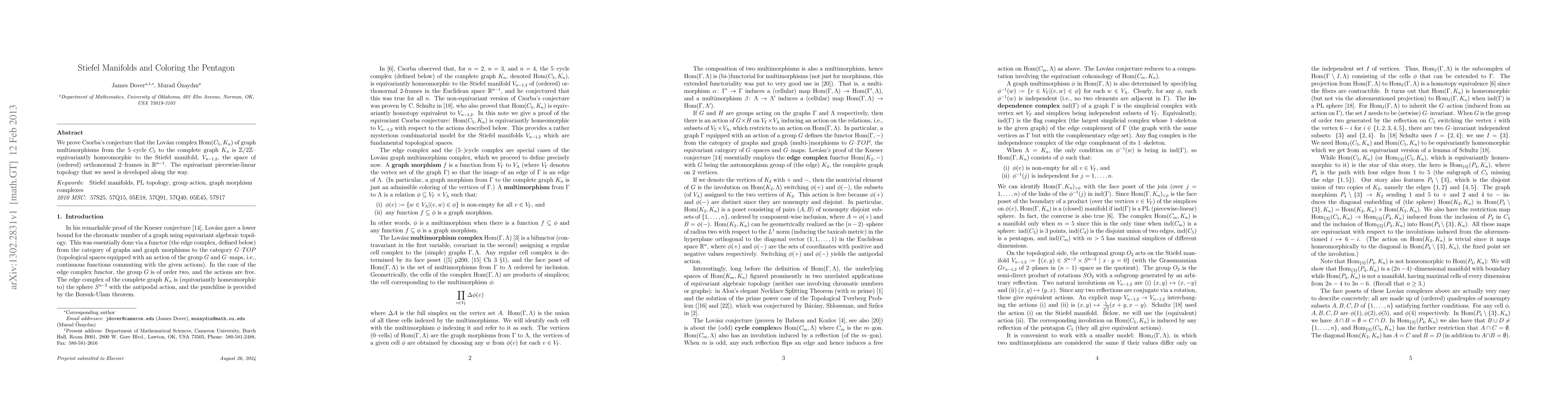 This paper proves Csorba's conjecture by demonstrating that the Lovász complex Hom(C_5,K_n) is Z/2Z-equivariantly homeomorphic to the Stiefel manifold V(n-1,2). The study develops an equivariant piecewise-linear topology to support this result.