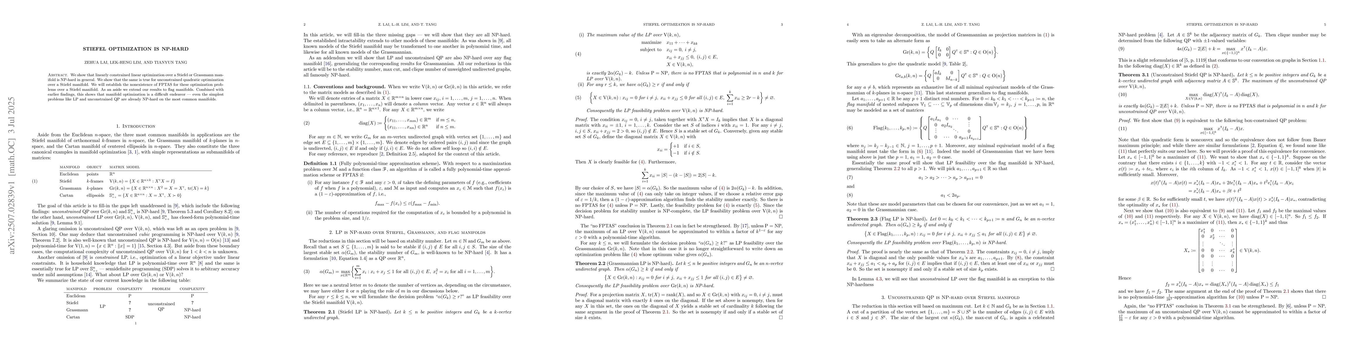 We show that linearly constrained linear optimization over a Stiefel or Grassmann manifold is NP-hard in general. We show that the same is true for unconstrained quadratic optimization over a Stiefel manifold. We will establish the nonexistence of FPTAS for these optimization problems over a Stiefel manifold. As an aside we extend our results to flag manifolds. Combined with earlier findings, this shows that manifold optimization is a difficult endeavor -- even the simplest problems like LP and unconstrained QP are already NP-hard on the most common manifolds.