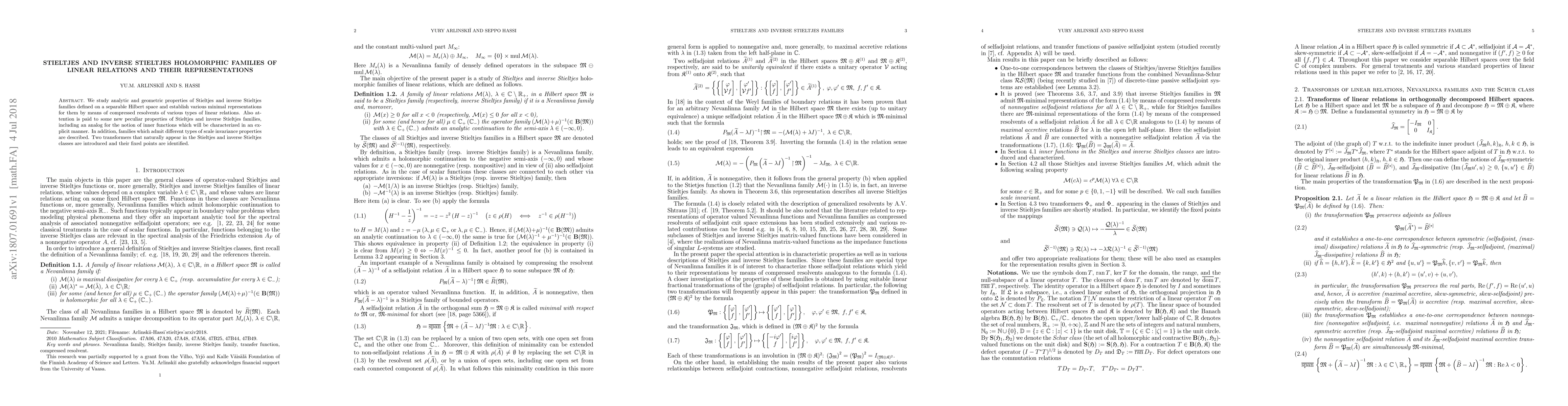 This paper investigates the analytic and geometric properties of Stieltjes and inverse Stieltjes holomorphic families of linear relations on a separable Hilbert space, establishing minimal representations through compressed resolvents. It also introduces new properties, including an analog for inner functions and scale invariance, and identifies fixed points of two relevant transformers.