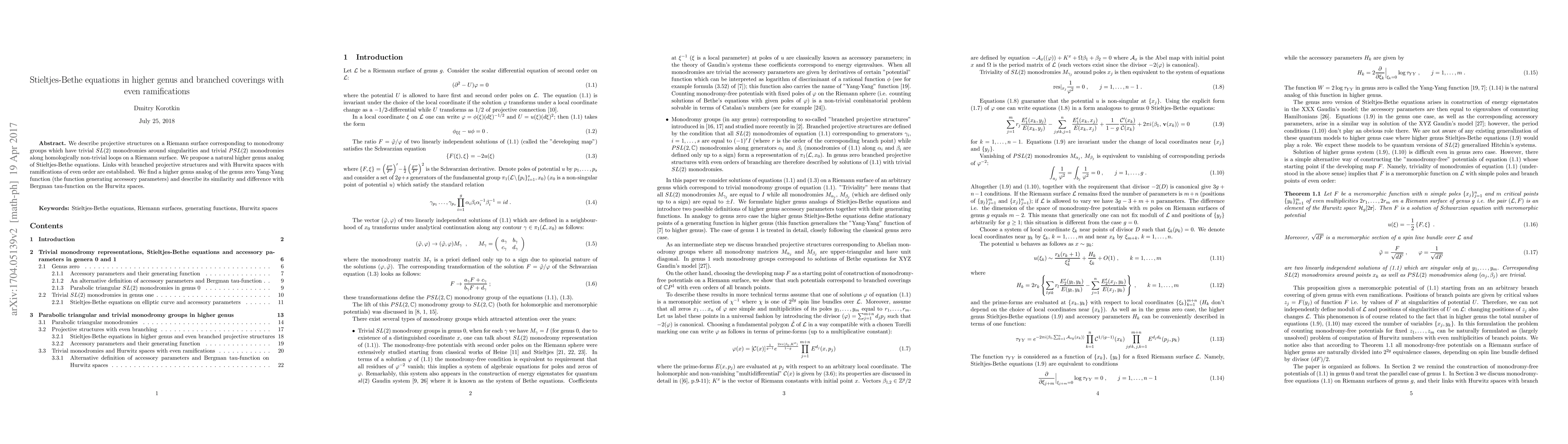 This paper proposes a higher genus analog of Stieltjes-Bethe equations for projective structures on Riemann surfaces with specific monodromy properties. It establishes connections to branched projective structures and Hurwitz spaces with even ramifications, and introduces a genus zero analog of the Yang-Yang function.