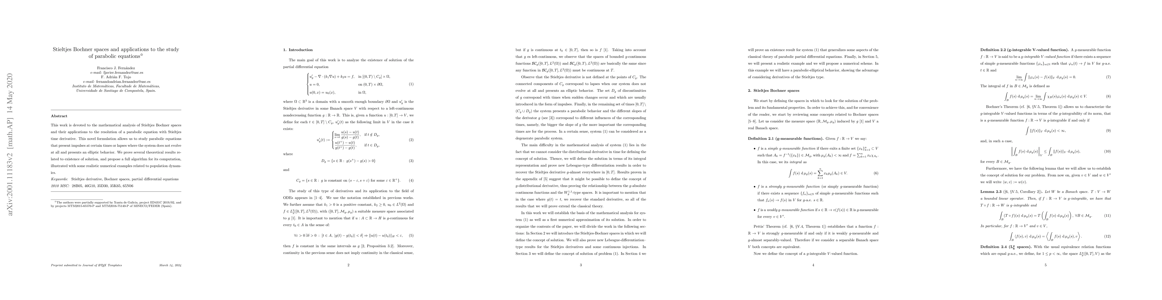 This work is devoted to the mathematical analysis of Stieltjes Bochner spaces and their applications to the resolution of a parabolic equation with Stieltjes time derivative. This novel formulation allows us to study parabolic equations that present impulses at certain times or lapses where the system does not evolve at all and presents an elliptic behavior. We prove several theoretical results related to existence of solution, and propose a full algorithm for its computation, illustrated with some realistic numerical examples related to population dynamics.