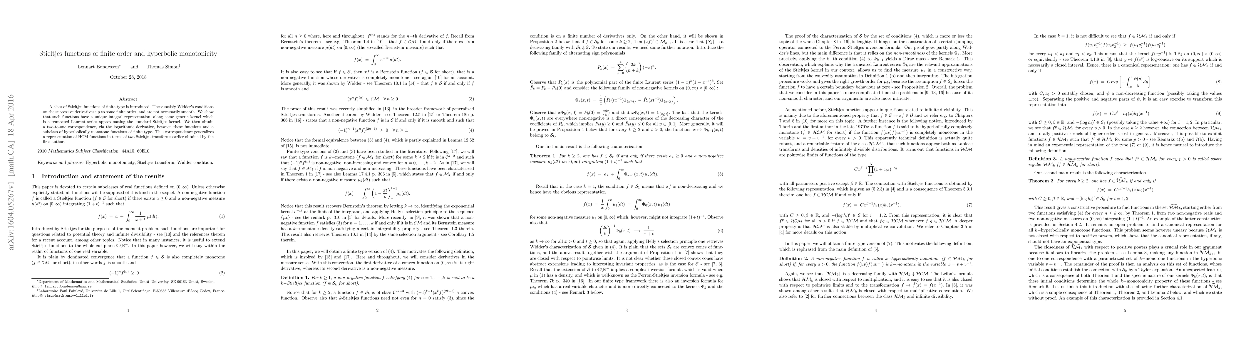 Researchers introduce a class of Stieltjes functions with finite order that satisfy Widder's conditions, demonstrating a unique integral representation and a correspondence to hyperbolically monotone functions, generalizing an earlier representation.