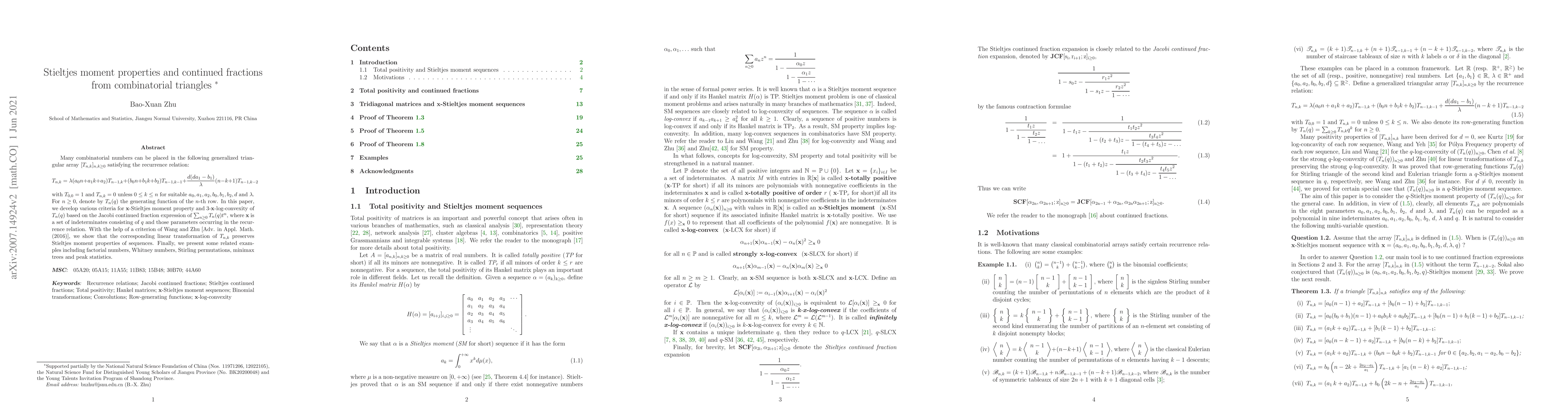 Many combinatorial numbers can be placed in the following generalized triangular array $[T_{n,k}]_{n,k\ge 0}$ satisfying the recurrence relation: \begin{equation*} T_{n,k}=\lambda(a_0n+a_1k+a_2)T_{n-1,k}+(b_0n+b_1k+b_2)T_{n-1,k-1}+\frac{d(da_1-b_1)}{\lambda}(n-k+1)T_{n-1,k-2} \end{equation*} with $T_{0,0}=1$ and $T_{n,k}=0$ unless $0\le k\le n$ for suitable $a_0,a_1,a_2,b_0,b_1,b_2,d$ and $\lambda$. For $n\geq0$, denote by $T_n(q)$ the generating function of the $n$-th row. In this paper, we develop various criteria for $\textbf{x}$-Stieltjes moment property and $3$-$\textbf{x}$-log-convexity of $T_n(q)$ based on the Jacobi continued fraction expression of $\sum_{n\geq0}T_n(q)t^n$, where $\textbf{x}$ is a set of indeterminates consisting of $q$ and those parameters occurring in the recurrence relation. With the help of a criterion of Wang and Zhu [Adv. in Appl. Math. (2016)], we show that the corresponding linear transformation of $T_{n,k}$ preserves Stieltjes moment properties of sequences. Finally, we present some related examples including factorial numbers, Whitney numbers, Stirling permutations, minimax trees and peak statistics.