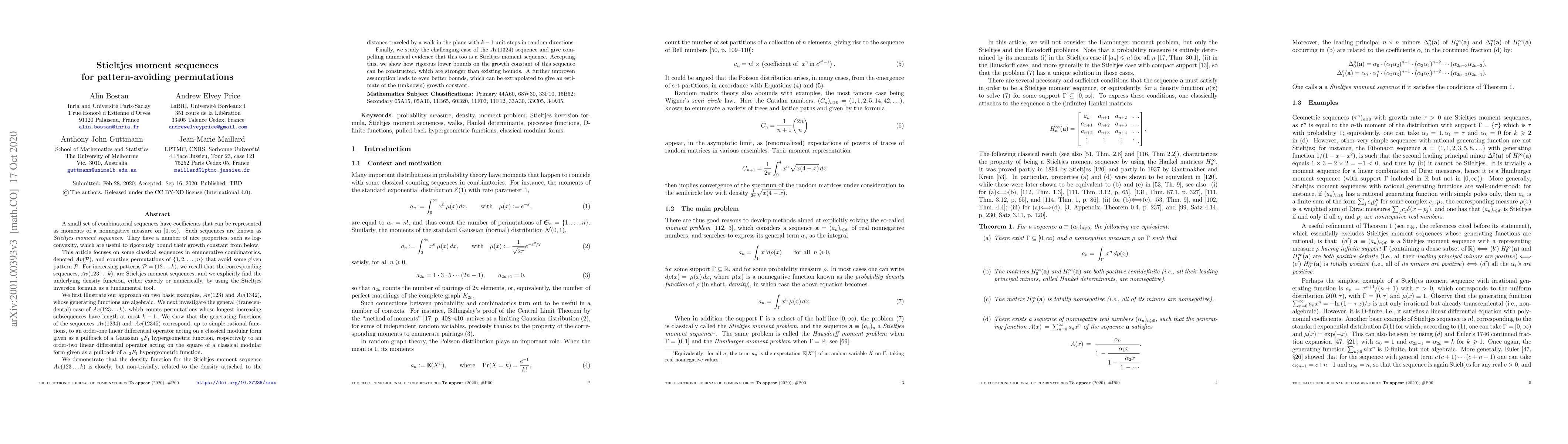 A small set of combinatorial sequences have coefficients that can be represented as moments of a nonnegative measure on $[0, \infty)$. Such sequences are known as Stieltjes moment sequences. This article focuses on some classical sequences in enumerative combinatorics, denoted $Av(\mathcal{P})$, and counting permutations of $\{1, 2, \ldots, n \}$ that avoid some given pattern $\mathcal{P}$. For increasing patterns $\mathcal{P}=(12\ldots k)$, we recall that the corresponding sequences, $Av(123\ldots k)$, are Stieltjes moment sequences, and we explicitly find the underlying density function, either exactly or numerically, by using the Stieltjes inversion formula as a fundamental tool. We show that the generating functions of the sequences $\, Av(1234)$ and $\, Av(12345)$ correspond, up to simple rational functions, to an order-one linear differential operator acting on a classical modular form given as a pullback of a Gaussian $\, _2F_1$ hypergeometric function, respectively to an order-two linear differential operator acting on the square of a classical modular form given as a pullback of a $\, _2F_1$ hypergeometric function. We demonstrate that the density function for the Stieltjes moment sequence $Av(123\ldots k)$ is closely, but non-trivially, related to the density attached to the distance traveled by a walk in the plane with $k-1$ unit steps in random directions. Finally, we study the challenging case of the $Av(1324)$ sequence and give compelling numerical evidence that this too is a Stieltjes moment sequence. Accepting this, we show how rigorous lower bounds on the growth constant of this sequence can be constructed, which are stronger than existing bounds. A further unproven assumption leads to even better bounds, which can be extrapolated to give an estimate of the (unknown) growth constant.