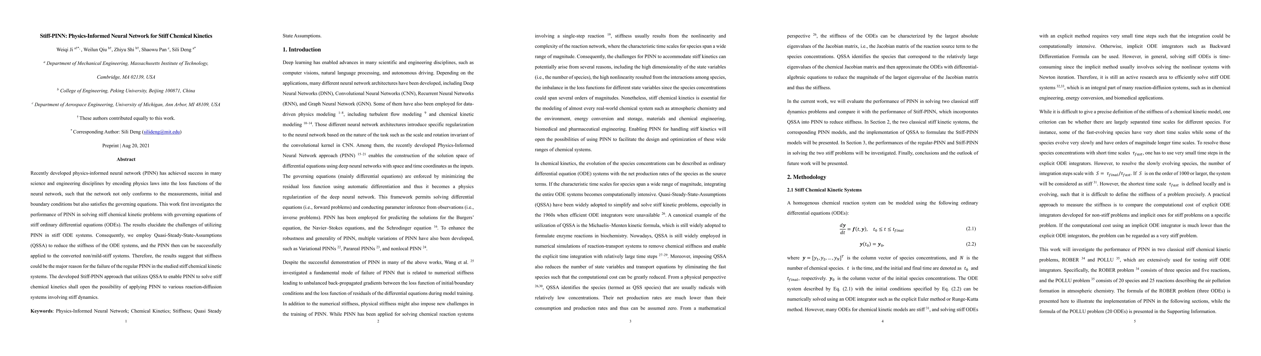 This research investigates the application of Physics-Informed Neural Networks (PINN) to solve stiff chemical kinetics governed by stiff ordinary differential equations (ODEs), finding that stiffness is a major reason for PINN failures. By employing Quasi-Steady-State-Assumptions (QSSA) to reduce stiffness, a new Stiff-PINN approach enables successful PINN application to non/mild-stiff systems, suggesting broader applicability to reaction-diffusion systems with stiff dynamics.