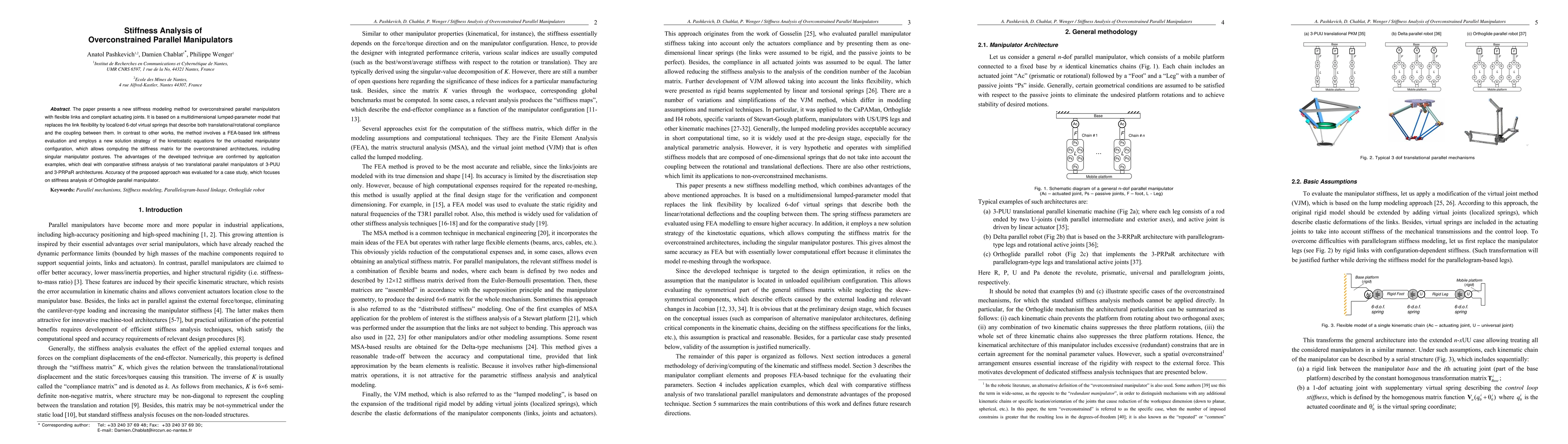 The paper introduces a new stiffness modeling method for overconstrained parallel manipulators using a multidimensional lumped-parameter model and FEA-based stiffness evaluation, enabling accurate analysis even in singular postures. The method is demonstrated through comparative analysis of 3-PUU and 3-PRPaR architectures and validated by a case study on the Orthoglide parallel manipulator.