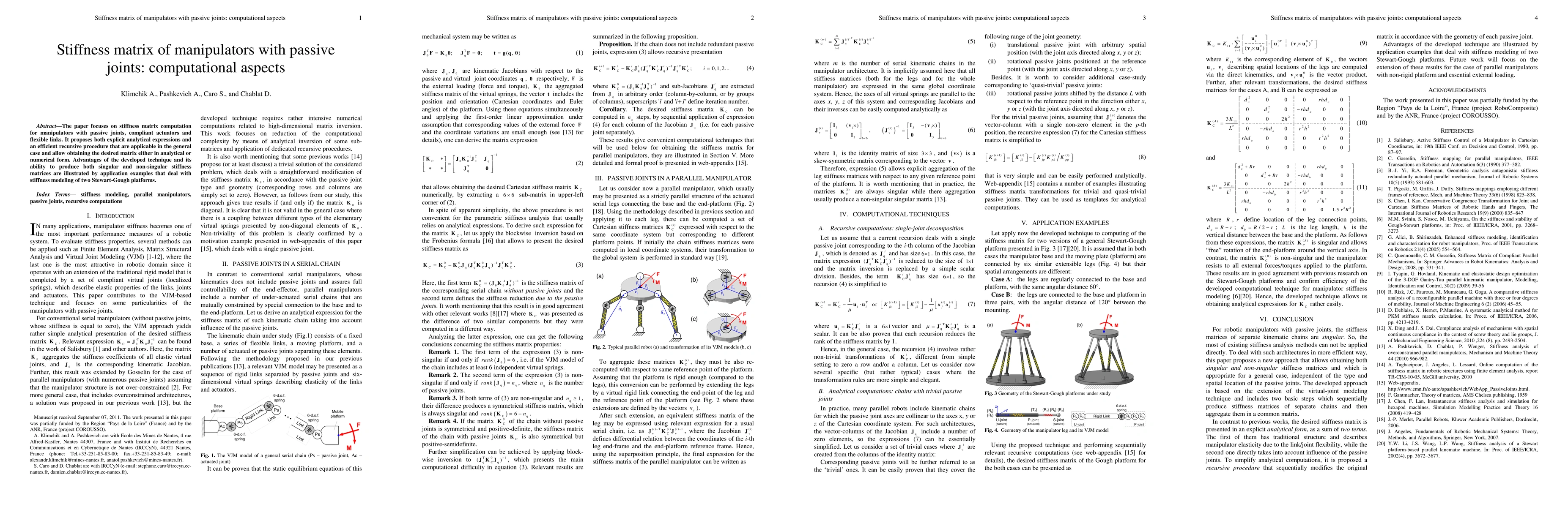 This paper develops analytical expressions and a recursive method for computing the stiffness matrix in manipulators with passive joints, compliant actuators, and flexible links, and demonstrates its effectiveness through examples involving two Stewart-Gough platforms.