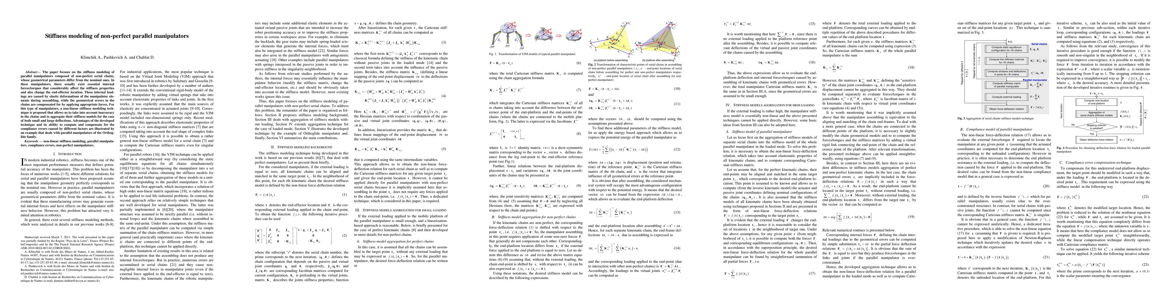 The paper focuses on the stiffness modeling of parallel manipulators composed of non-perfect serial chains, whose geometrical parameters differ from the nominal ones. In these manipulators, there usually exist essential internal forces/torques that considerably affect the stiffness properties and also change the end-effector location. These internal load-ings are caused by elastic deformations of the manipulator ele-ments during assembling, while the geometrical errors in the chains are compensated for by applying appropriate forces. For this type of manipulators, a non-linear stiffness modeling tech-nique is proposed that allows us to take into account inaccuracy in the chains and to aggregate their stiffness models for the case of both small and large deflections. Advantages of the developed technique and its ability to compute and compensate for the compliance errors caused by different factors are illustrated by an example that deals with parallel manipulators of the Or-thoglide family