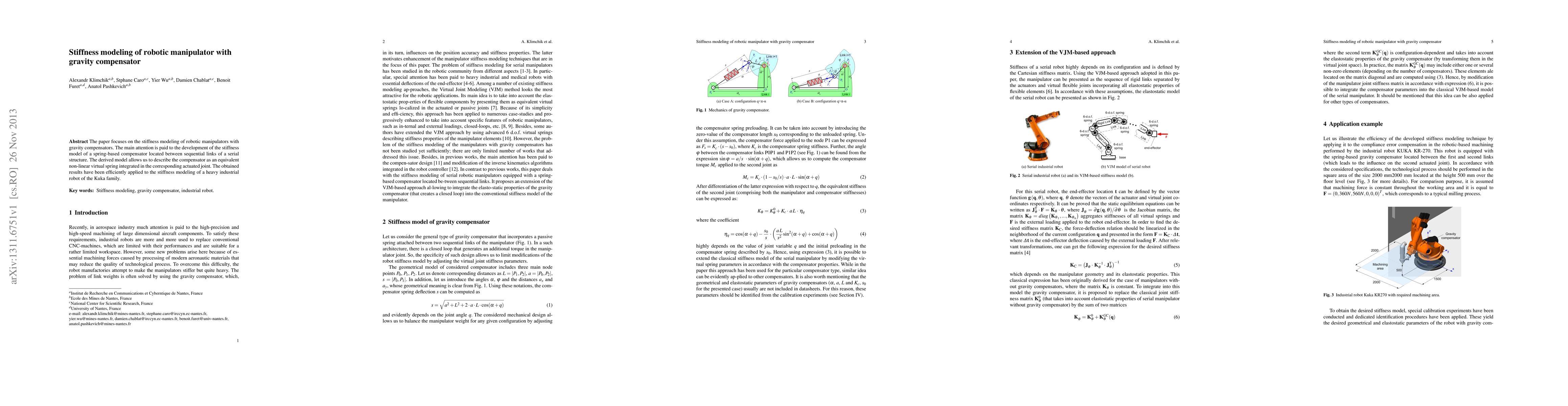 The paper focuses on the stiffness modeling of robotic manipulators with gravity compensators. The main attention is paid to the development of the stiffness model of a spring-based compensator located between sequential links of a serial structure. The derived model allows us to describe the compensator as an equivalent non-linear virtual spring integrated in the corresponding actuated joint. The obtained results have been efficiently applied to the stiffness modeling of a heavy industrial robot of the Kuka family.