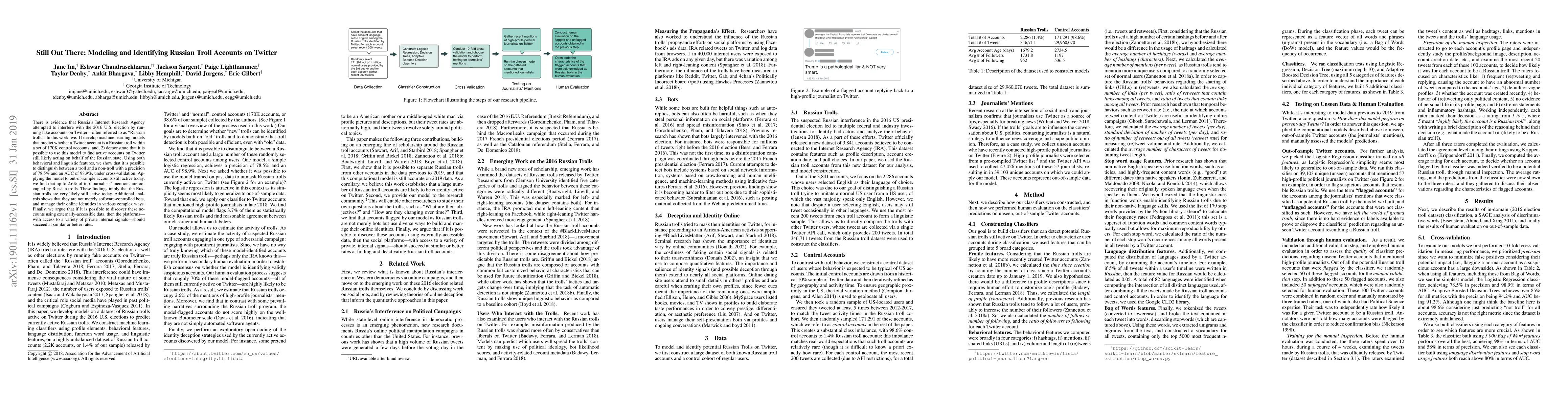 There is evidence that Russia's Internet Research Agency attempted to interfere with the 2016 U.S. election by running fake accounts on Twitter - often referred to as "Russian trolls". In this work, we: 1) develop machine learning models that predict whether a Twitter account is a Russian troll within a set of 170K control accounts; and, 2) demonstrate that it is possible to use this model to find active accounts on Twitter still likely acting on behalf of the Russian state. Using both behavioral and linguistic features, we show that it is possible to distinguish between a troll and a non-troll with a precision of 78.5% and an AUC of 98.9%, under cross-validation. Applying the model to out-of-sample accounts still active today, we find that up to 2.6% of top journalists' mentions are occupied by Russian trolls. These findings imply that the Russian trolls are very likely still active today. Additional analysis shows that they are not merely software-controlled bots, and manage their online identities in various complex ways. Finally, we argue that if it is possible to discover these accounts using externally - accessible data, then the platforms - with access to a variety of private internal signals - should succeed at similar or better rates.