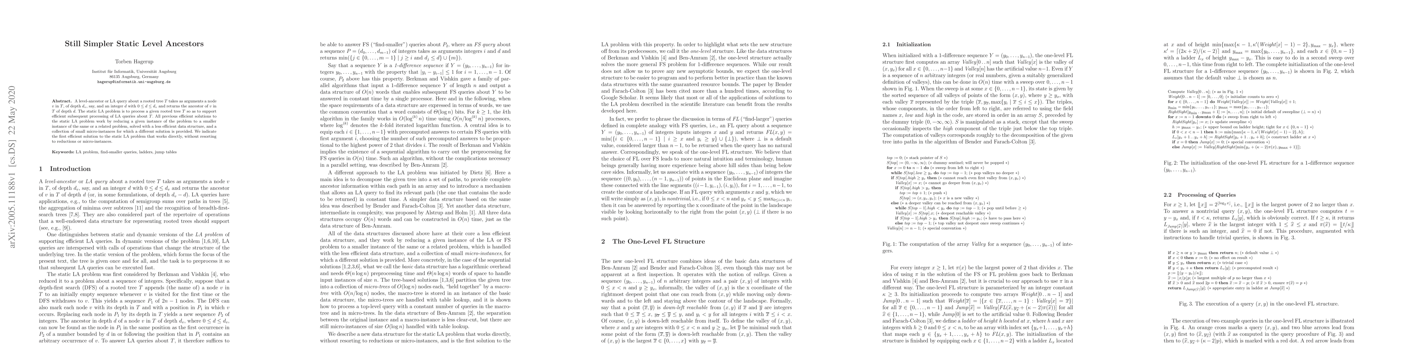 A level-ancestor or LA query about a rooted tree $T$ takes as arguments a node $v$ in $T$, of depth $d_v$, say, and an integer $d$ with $0\le d\le d_v$ and returns the ancestor of $v$ in $T$ of depth $d$. The static LA problem is to process a given rooted tree $T$ so as to support efficient subsequent processing of LA queries about $T$. All previous efficient solutions to the static LA problem work by reducing a given instance of the problem to a smaller instance of the same or a related problem, solved with a less efficient data structure, and a collection of small micro-instances for which a different solution is provided. We indicate the first efficient solution to the static LA problem that works directly, without resorting to reductions or micro-instances.