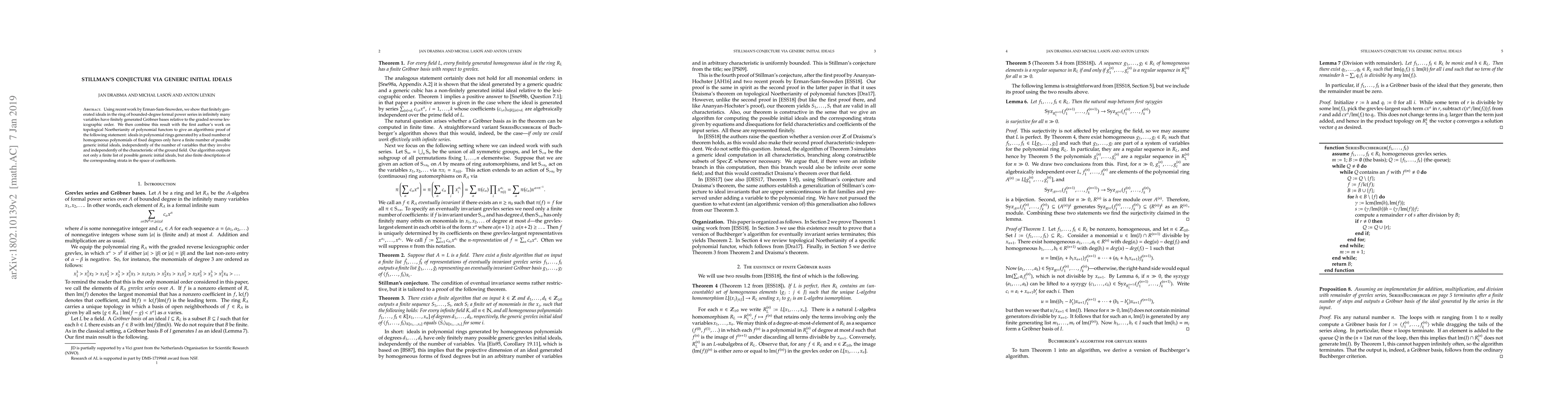 Title: Stillman's conjecture via generic initial ideals Summary: The paper proves Stillman's conjecture by showing that finitely generated ideals in polynomial rings, generated by a fixed number of polynomials of fixed degrees, have a finite number of possible generic initial ideals, using Gröbner basis techniques and topological Noetherianity. The algorithm also provides descriptions of the corresponding coefficient strata.