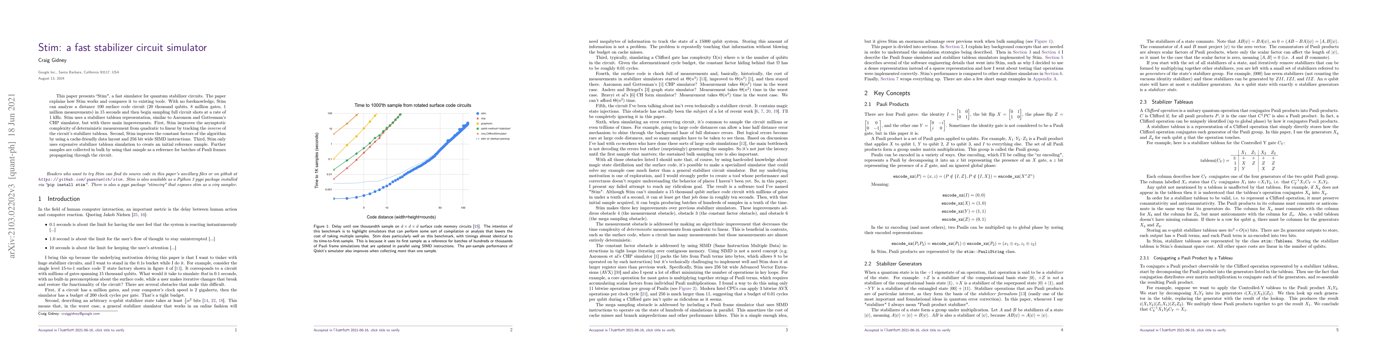 Stim is a high-performance simulator for quantum stabilizer circuits, capable of analyzing large surface code circuits quickly and efficiently. It achieves linear complexity for measurement and uses advanced data layouts and SIMD instructions to maintain high throughput.