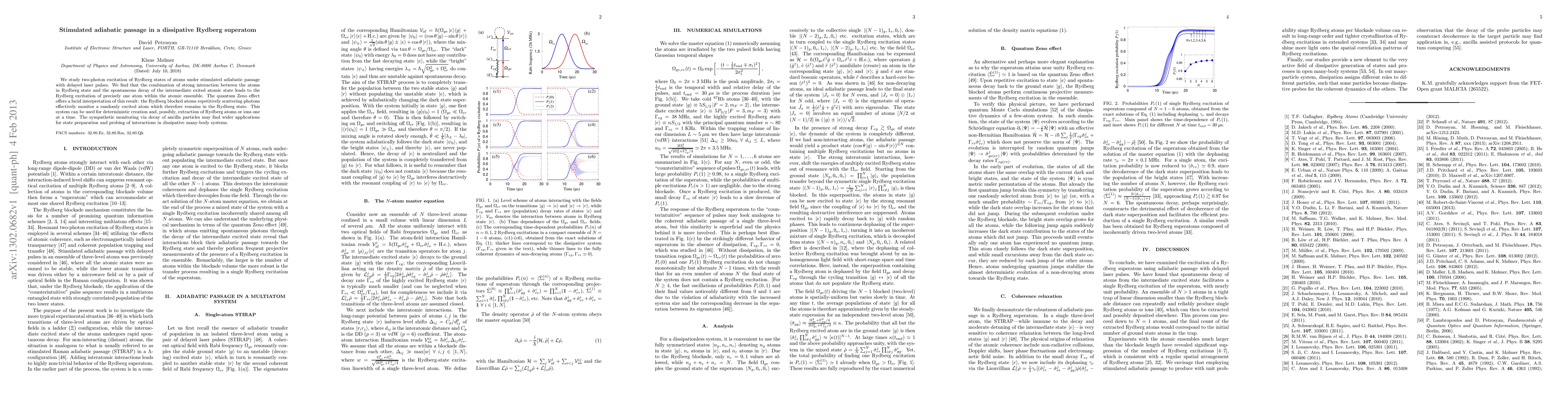 This paper investigates the use of stimulated adiabatic passage with delayed laser pulses to achieve precise two-photon excitation of Rydberg states in an atomic ensemble, demonstrating deterministic creation of a single Rydberg atom through quantum Zeno effect-driven monitoring. The findings suggest potential applications for state preparation and probing interactions in dissipative many-body systems.