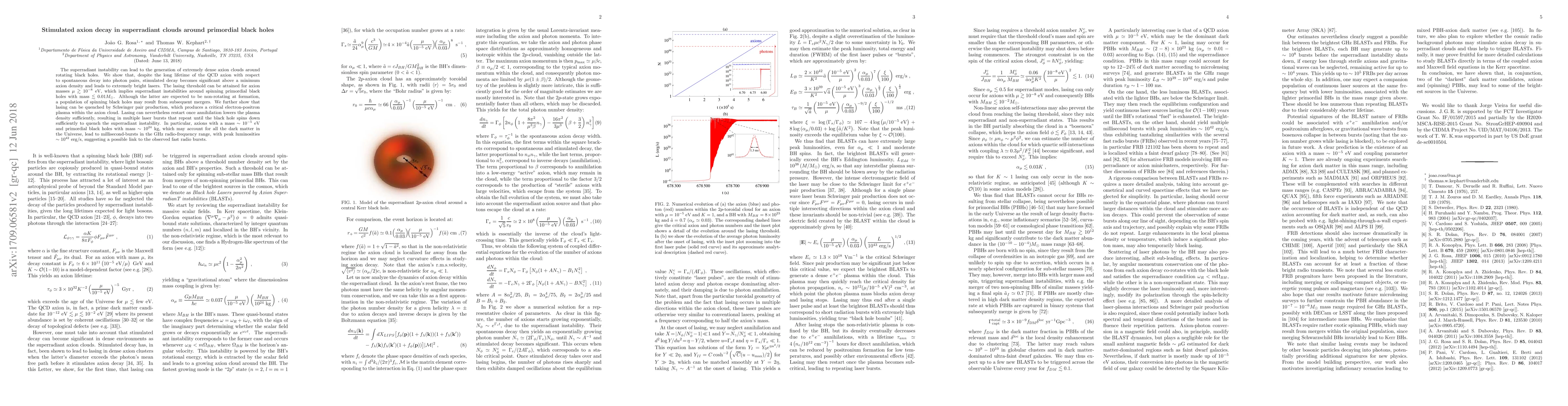 This paper explores the stimulated decay of QCD axions into photon pairs in superradiant clouds around rotating primordial black holes, leading to extremely bright laser-like emissions. It suggests that such lasing can occur for axion masses around $10^{-8}$ eV and may be linked to fast radio bursts, with the potential for multiple laser bursts as the black hole's spin decreases.