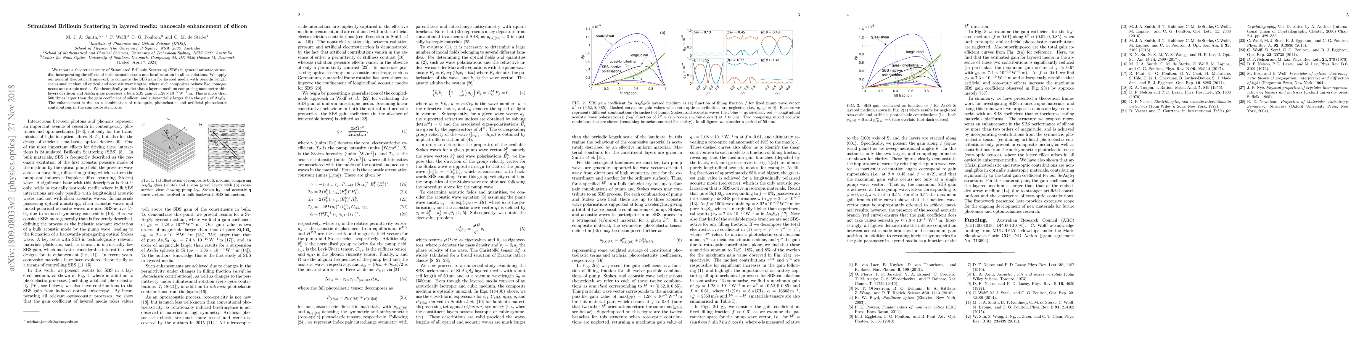 This paper presents a theoretical study on Stimulated Brillouin Scattering (SBS) in anisotropic layered media, predicting a significant enhancement in SBS gain for a composite of silicon and As$_2$S$_3$ glass, achieving a gain over 500 times greater than pure silicon due to roto-optic and artificial photoelastic effects.