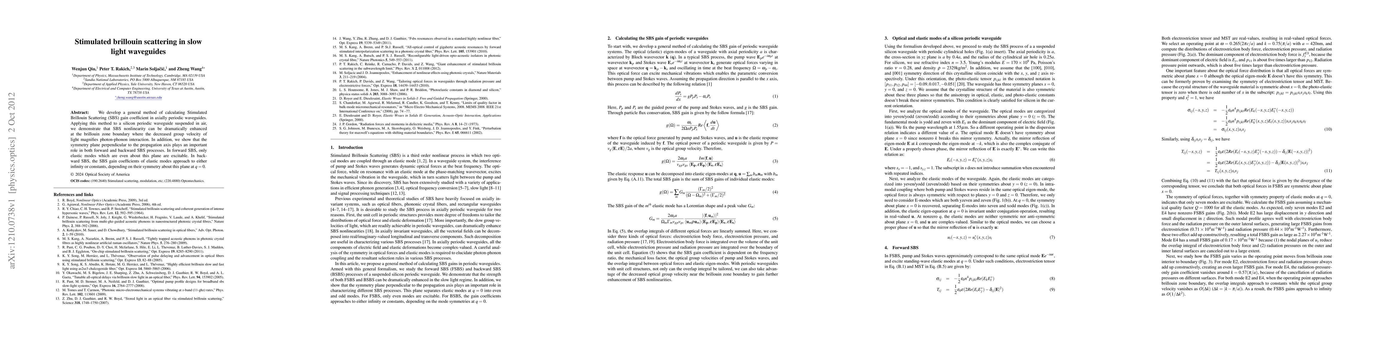 This paper presents a method for calculating the Stimulated Brillouin Scattering (SBS) gain coefficient in axially periodic waveguides, demonstrating significant enhancement at the Brillouin zone boundary due to slow light effects. It highlights the role of symmetry planes in the waveguide's SBS processes, with specific implications for forward and backward SBS.